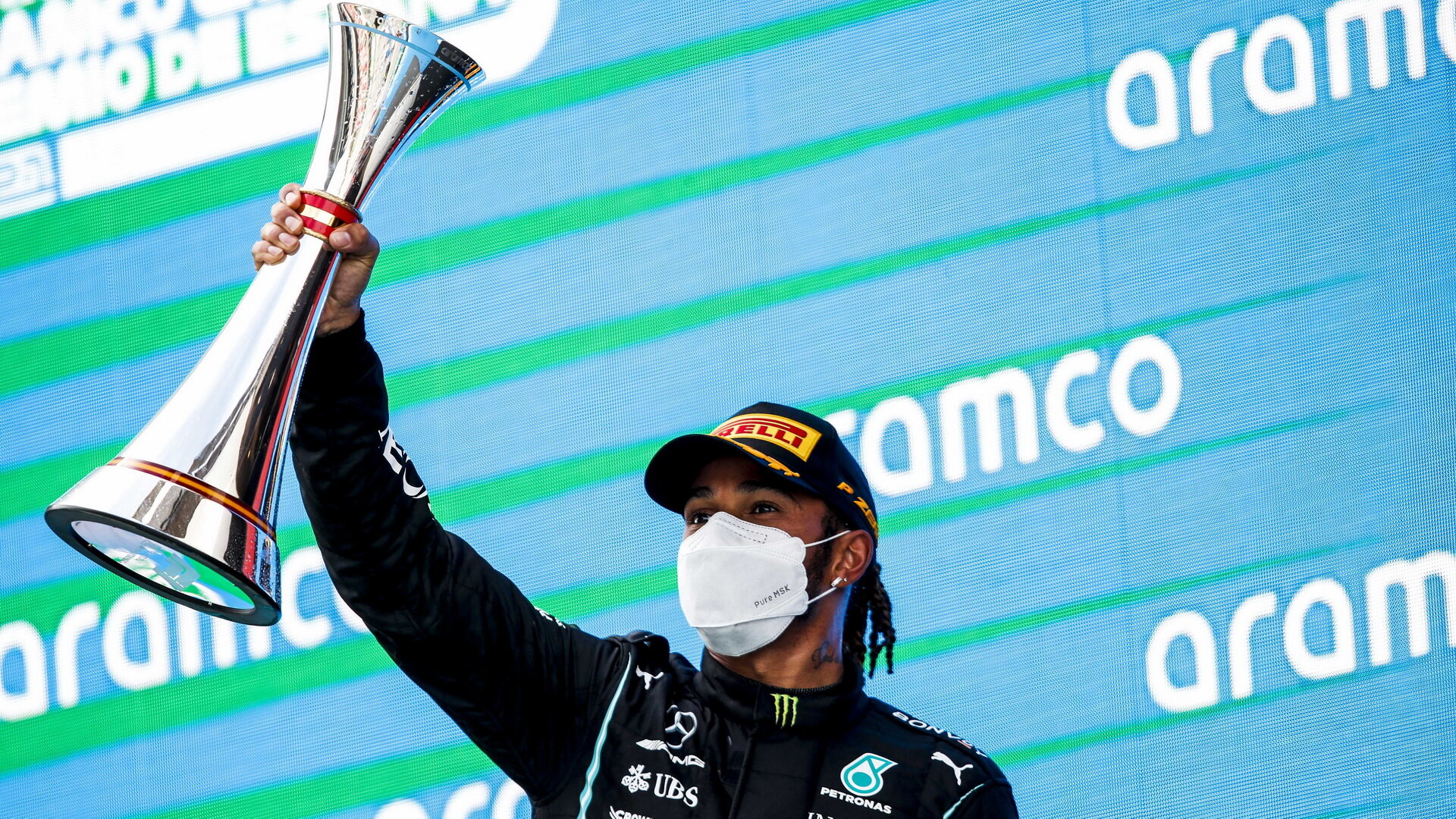 Lewis Hamilton se svou trofejí za první místo v závodě v Barceloně