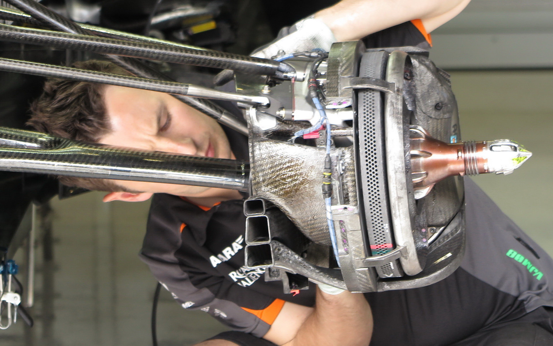 Detail zavěšení kola vozu Force India VJM08 Mercedes