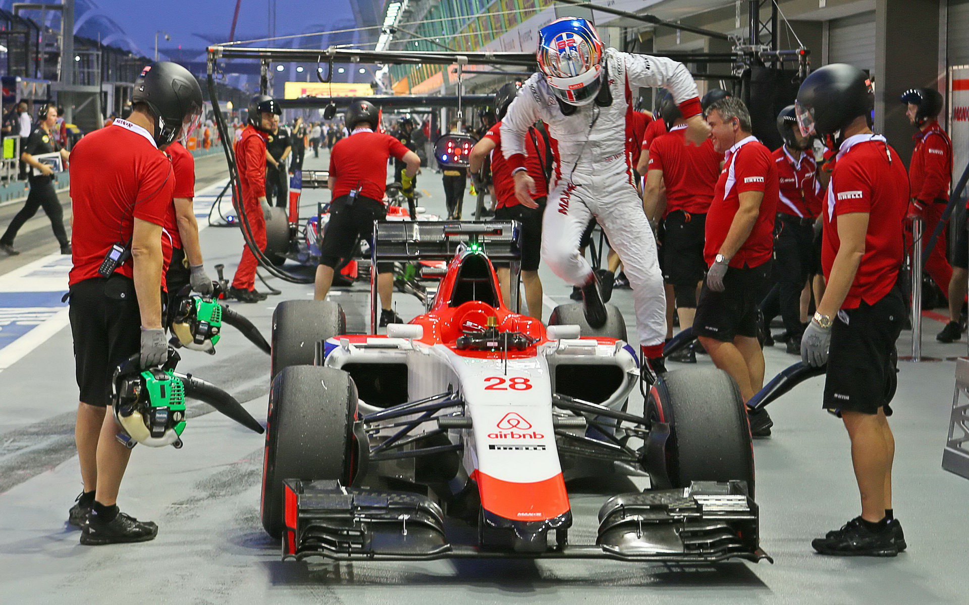 Will Stevens vyskakuje z vozu, GP Singapuru (Singapur)