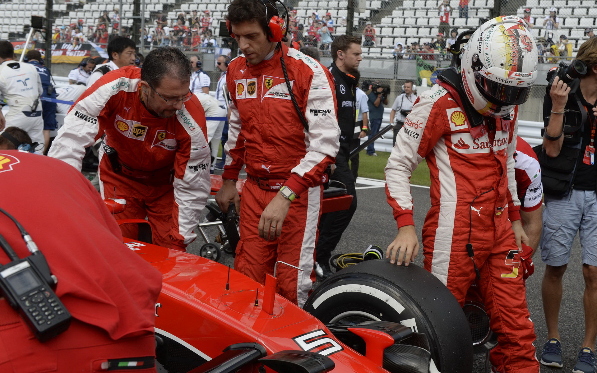 Sebastian Vettel kontroluje pneumatiky před startem v Suzuce