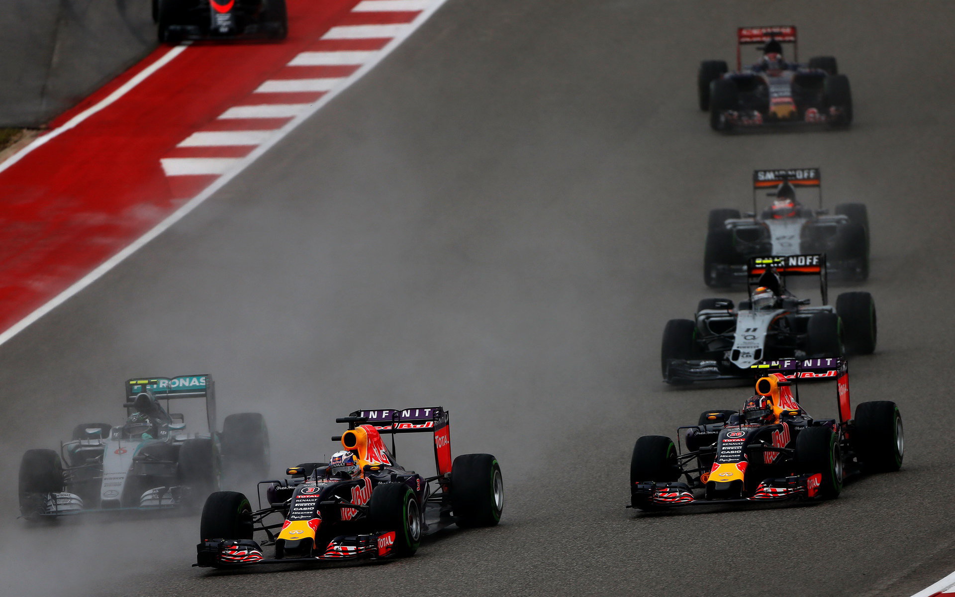 Daniel Ricciardo předjíždí Daniiela Kvjata a Nica Rosberga v Austinu