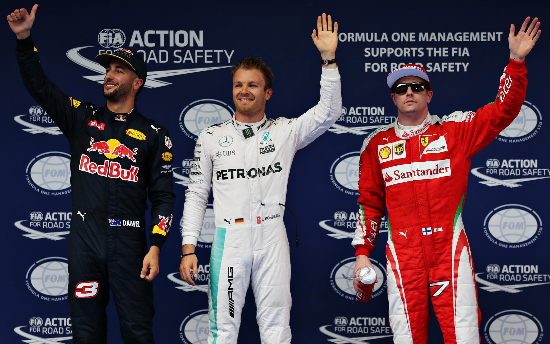 Daniel Ricciardo, Nico Rosberg a Kimi Räikkönen po kvalifikaci v Číně