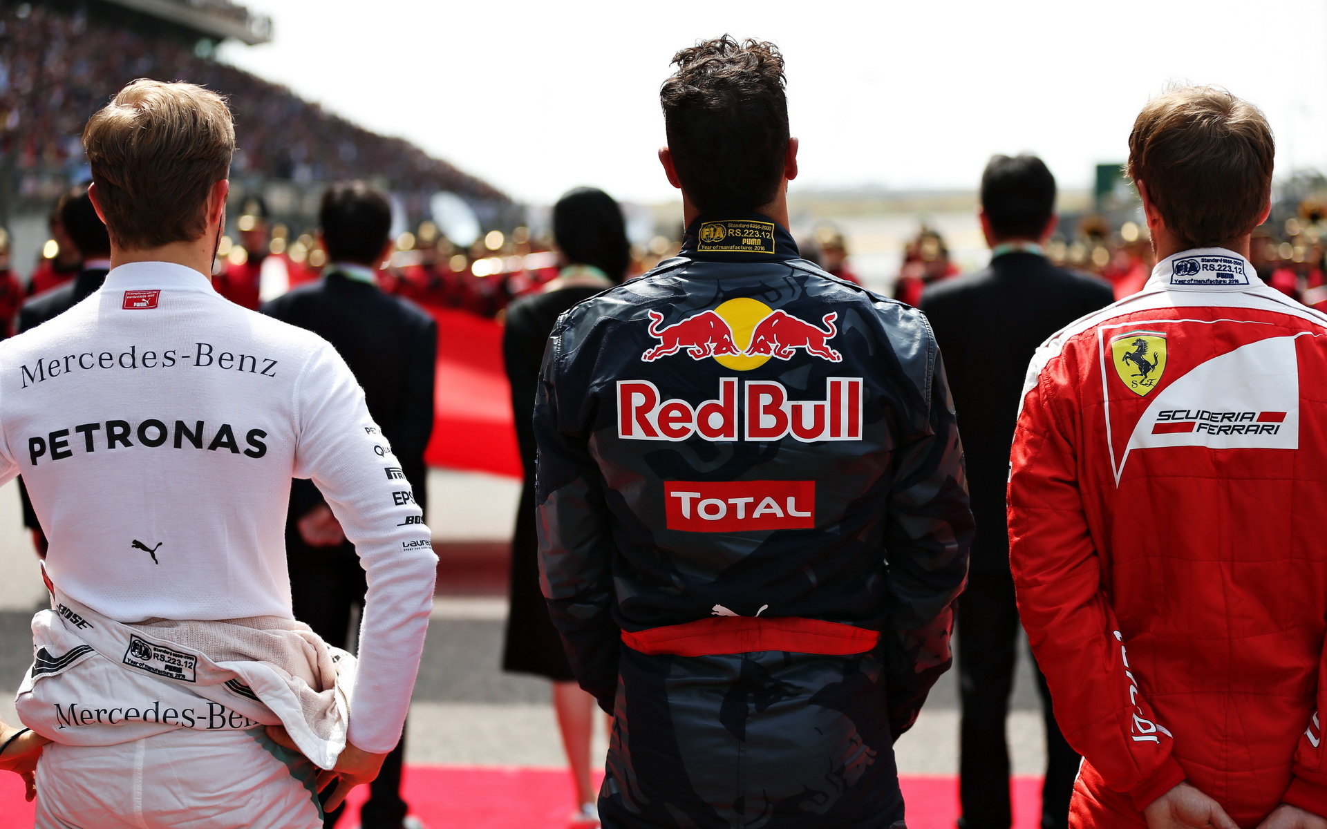 Nico Rosberg, Daniel Ricciardo a Sebastian Vettel před závodem v Číně