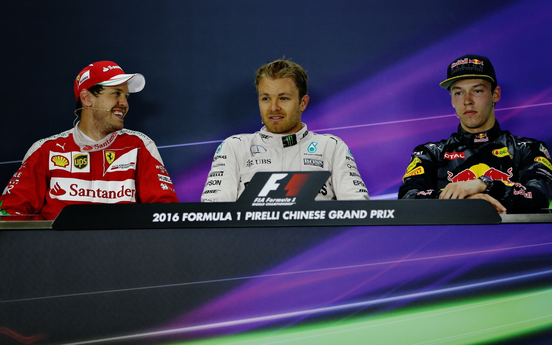 Sebastian Vettel, Nico Rosberg a Daniil Kvjat na tiskovnce po závodě v Číně