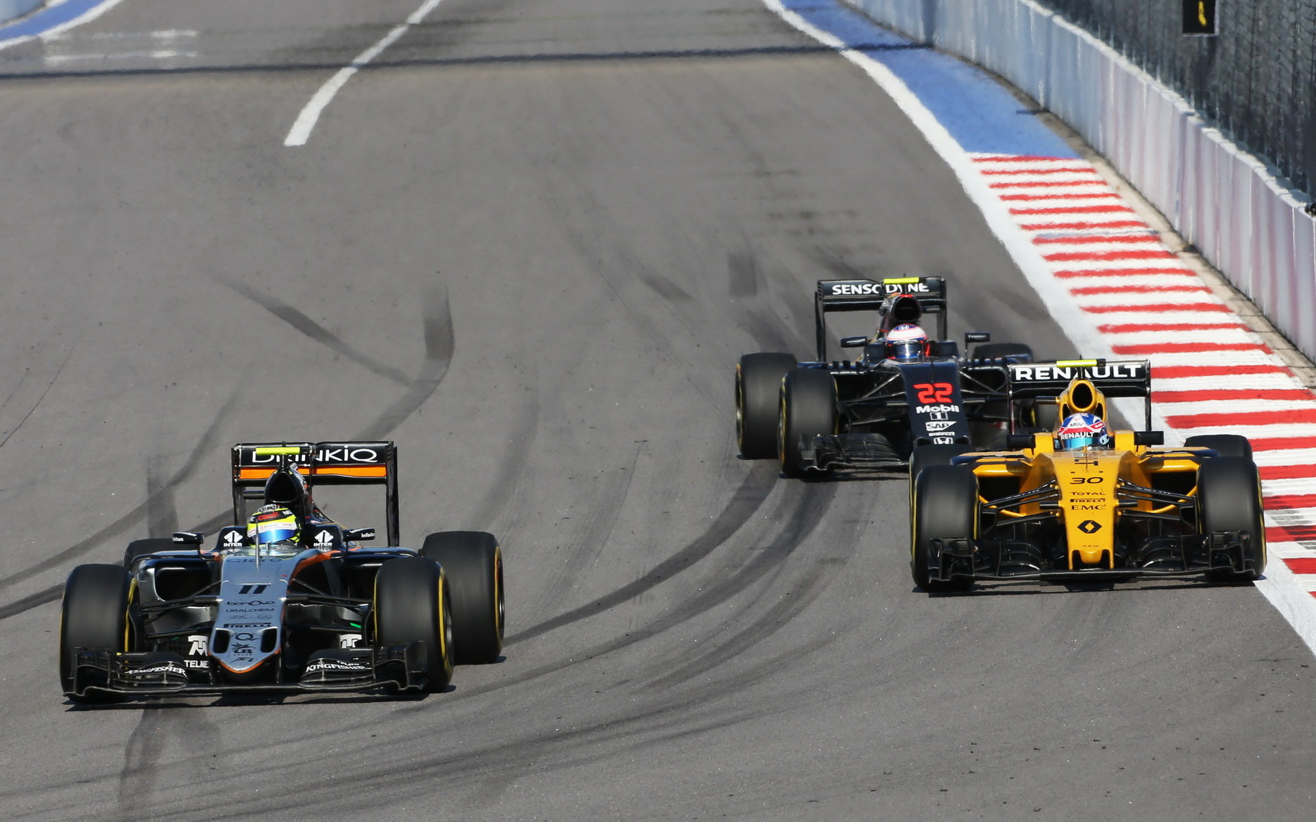 Sergio Pérez, Jolyon Palmer a Jenson Button při závodě v Soči