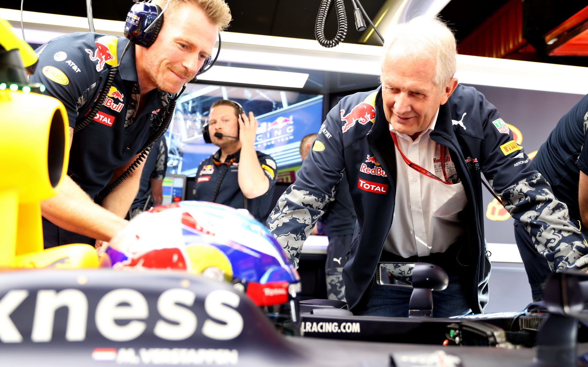 Max Verstappen a Helmut Marko při tréninku v Barceloně