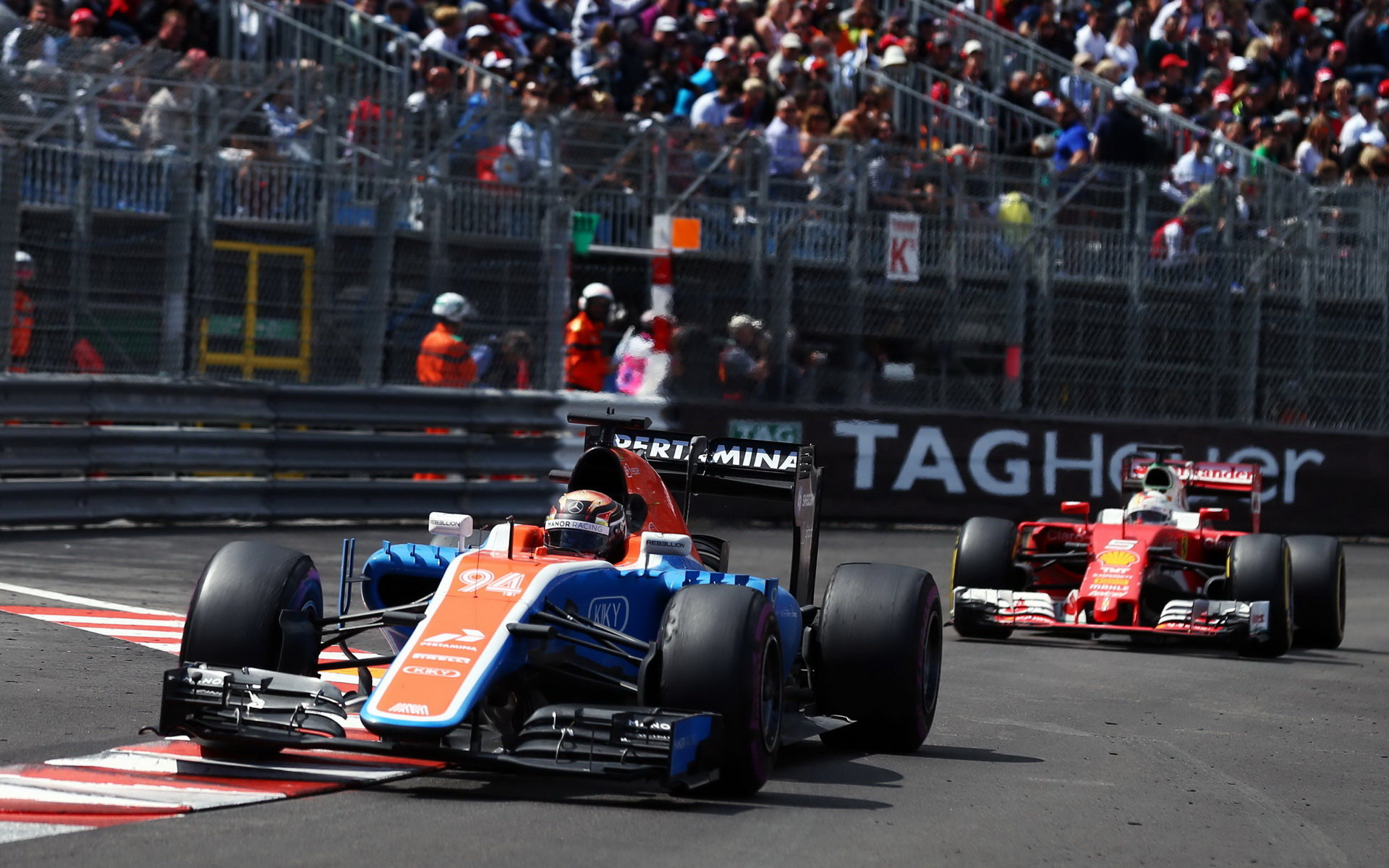 Pascal Wehrlein a Sebastian Vettel v závodě v Monaku