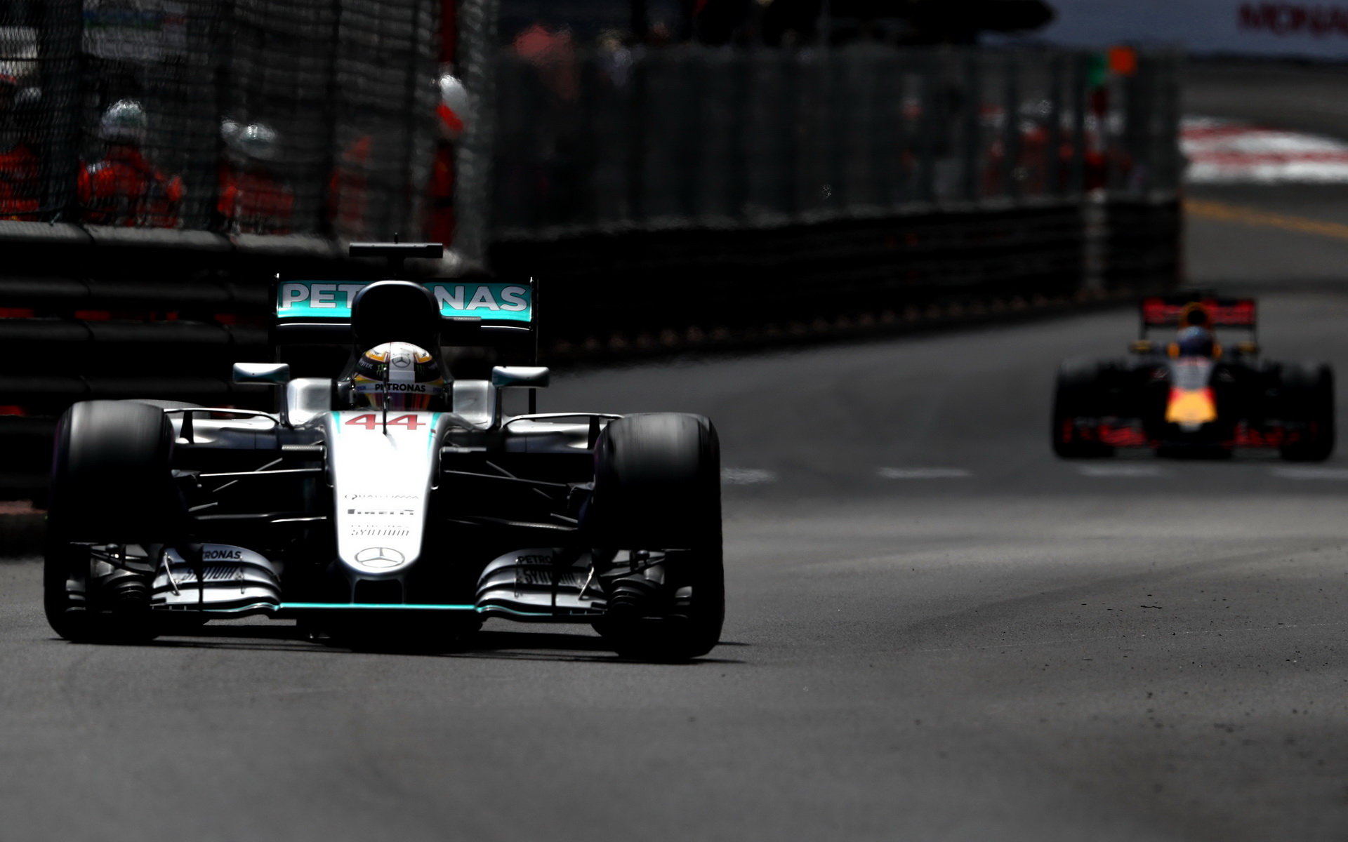 Lewis Hamilton před Danielem Ricciardem v závodě v Monaku