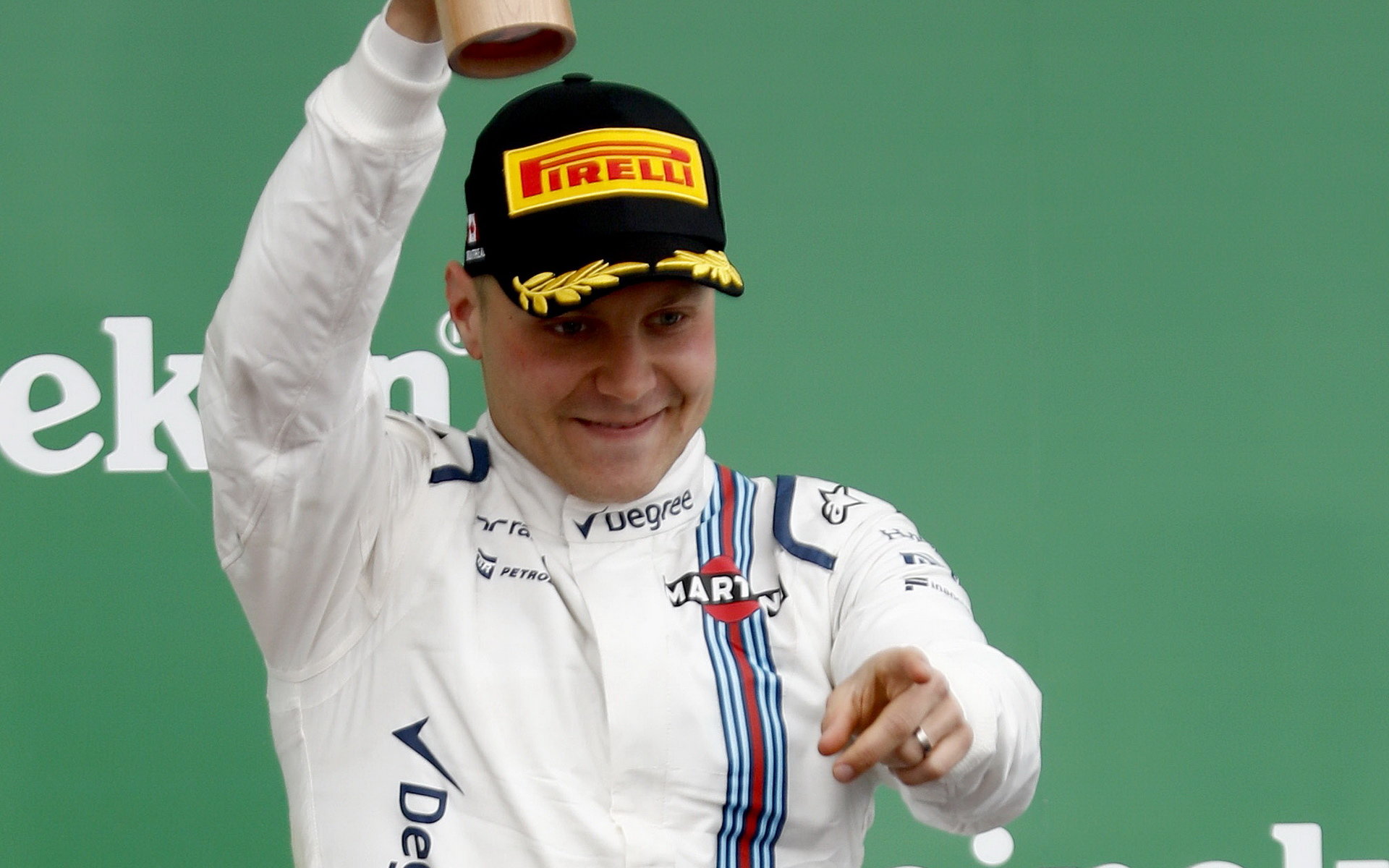Valtteri Bottas se raduje na pódiu po závodě v Kanadě