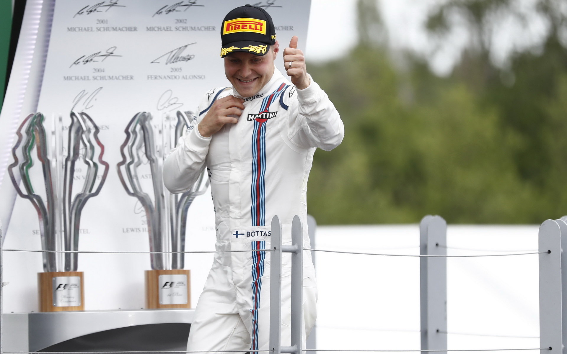 Valtteri Bottas se raduje na pódiu po závodě v Kanadě