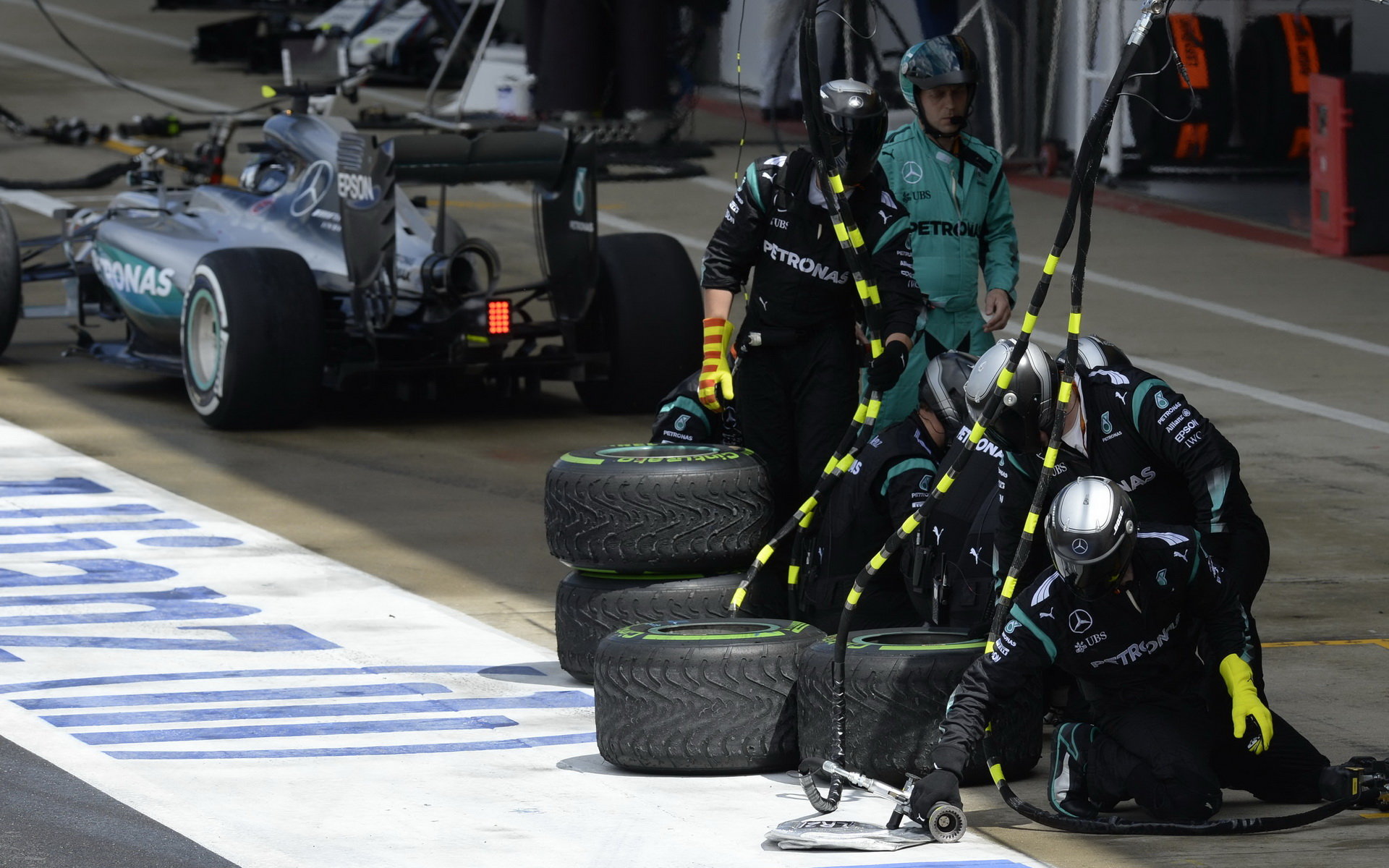 Tým mechaniků Mercedes v závodě v Silverstone
