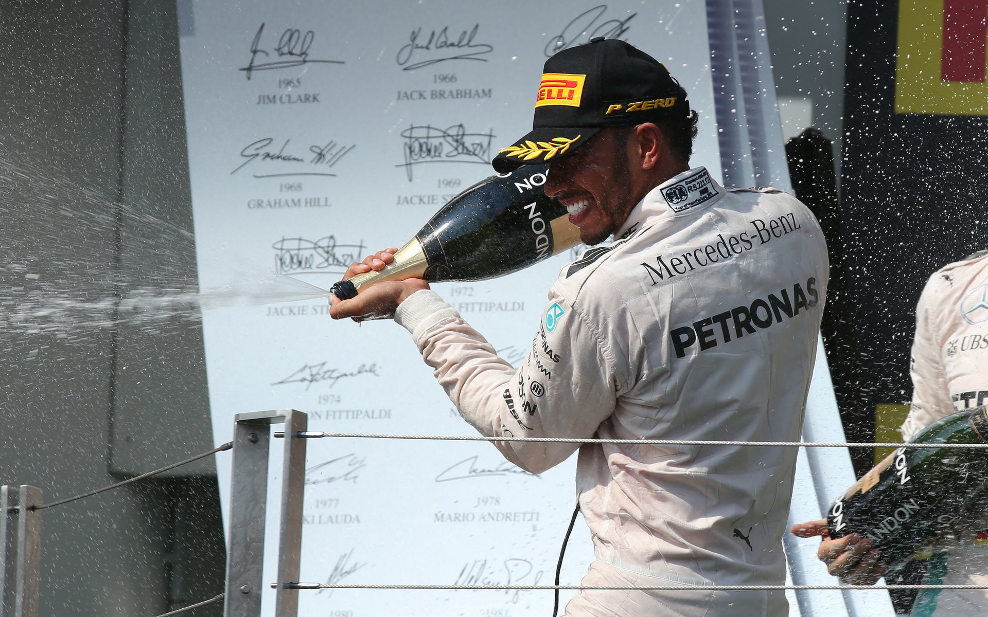 Lewis Hamilton na pódiu po závodě v Maďarsku