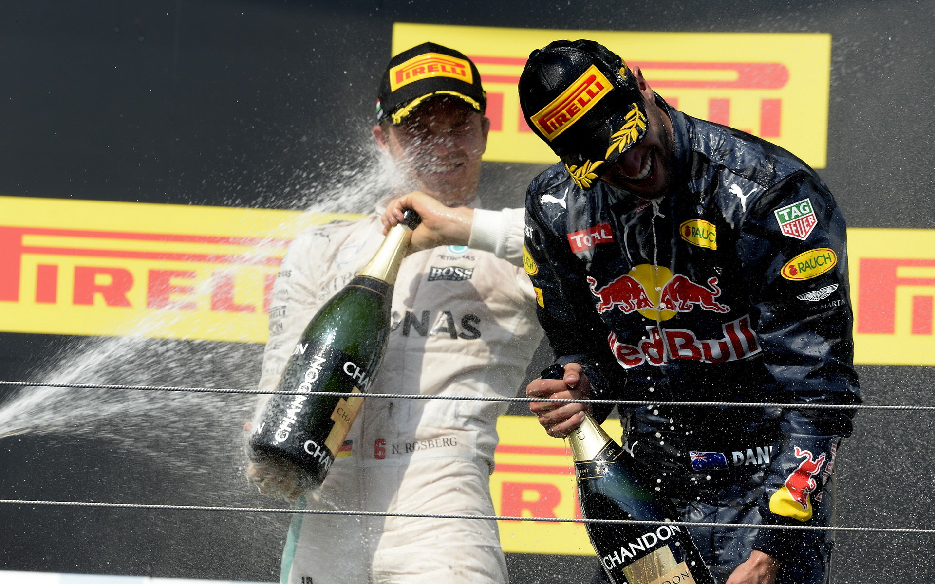 Nico Rosberg a Daniel Ricciardo slaví po závodě v Maďarsku