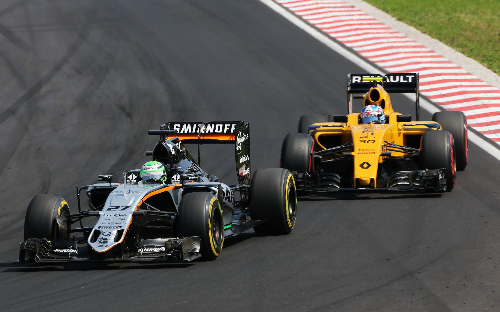 Nico Hülkenberg a Jolyon Palmer v závodě v Maďarsku