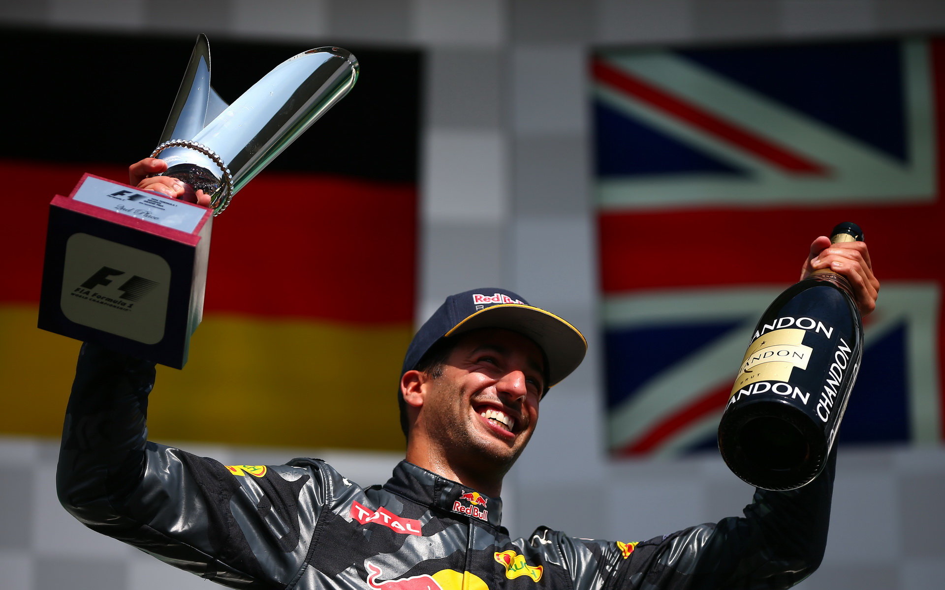 Daniel Ricciardo se svou trofejí na pódiu po závodě v Belgii