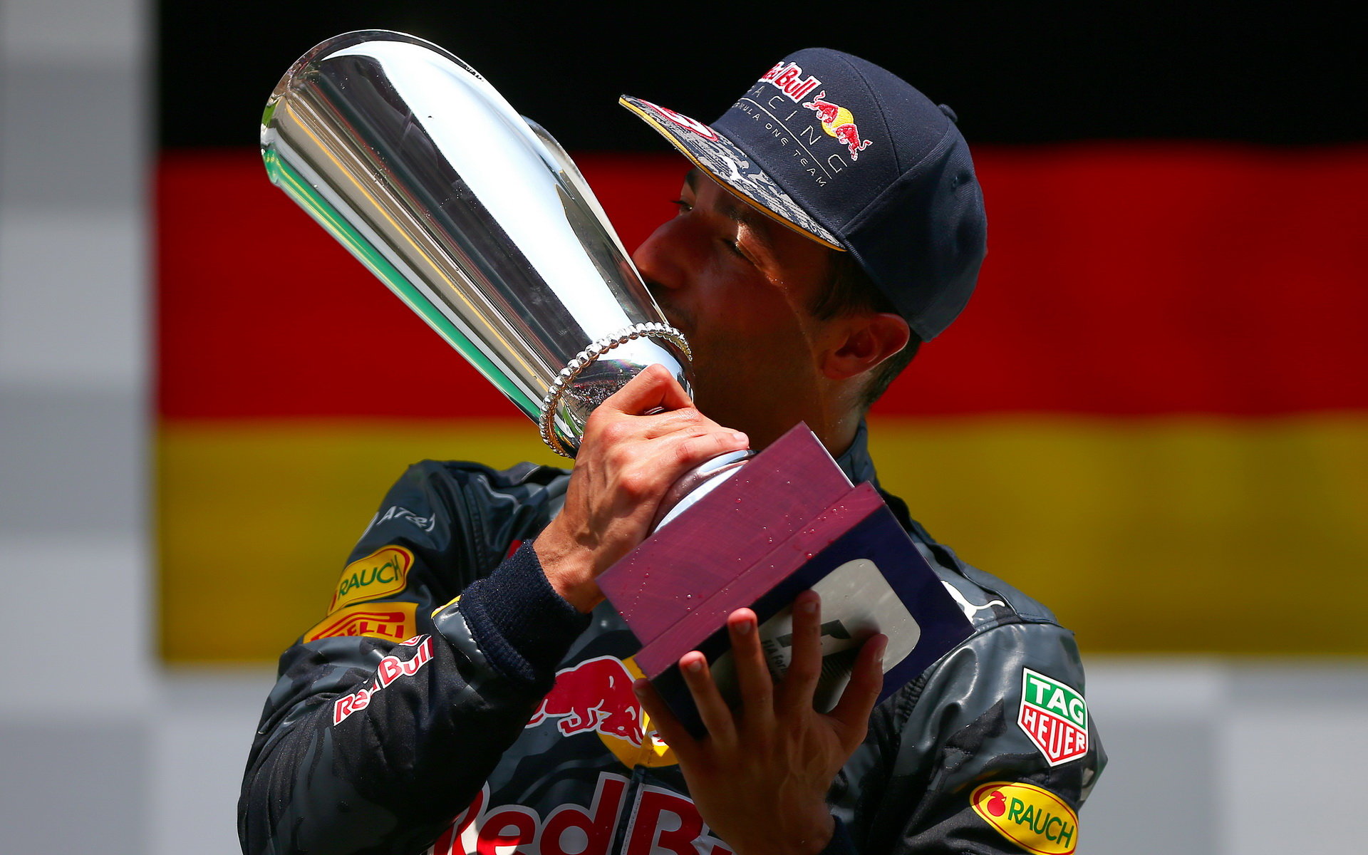 Daniel Ricciardo se svou trofejí na pódiu po závodě v Belgii