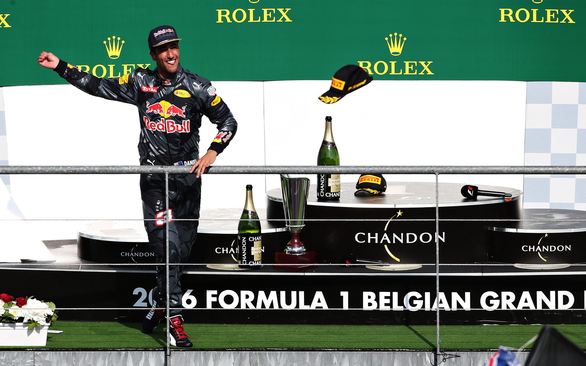 Daniel Ricciardo na pódiu po závodě v Belgii