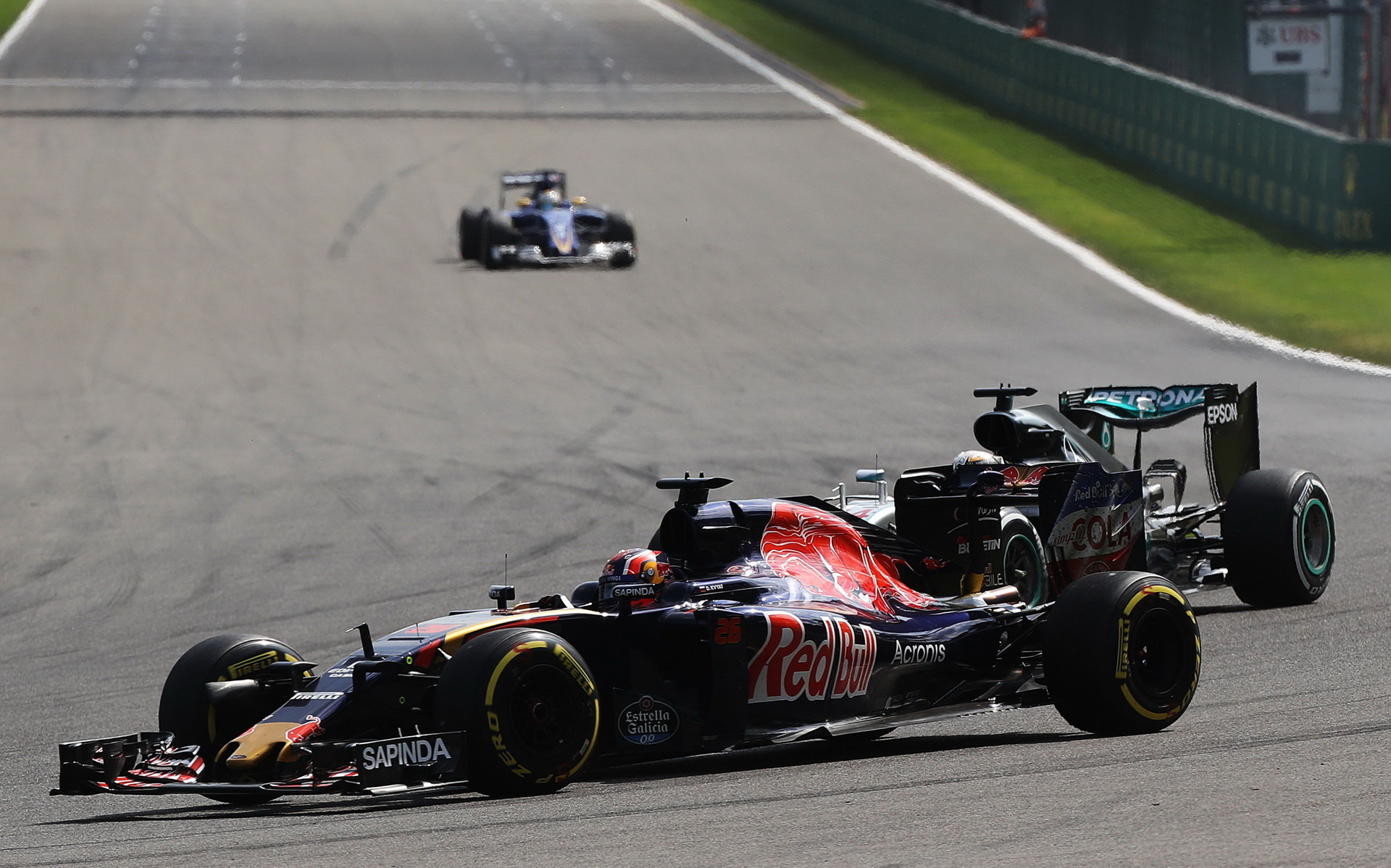 Daniil Kvjat a Lewis Hamilton v závodě v Belgii