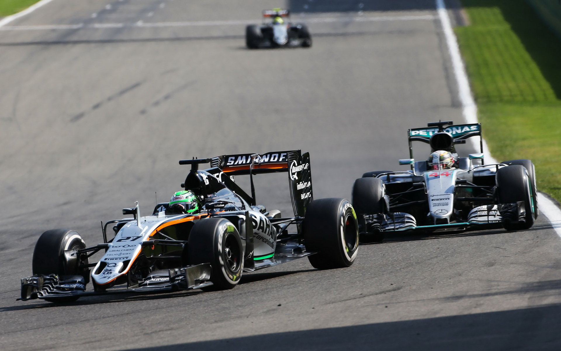 Nico Hülkenberg a Lewis Hamilton v závodě v Belgii