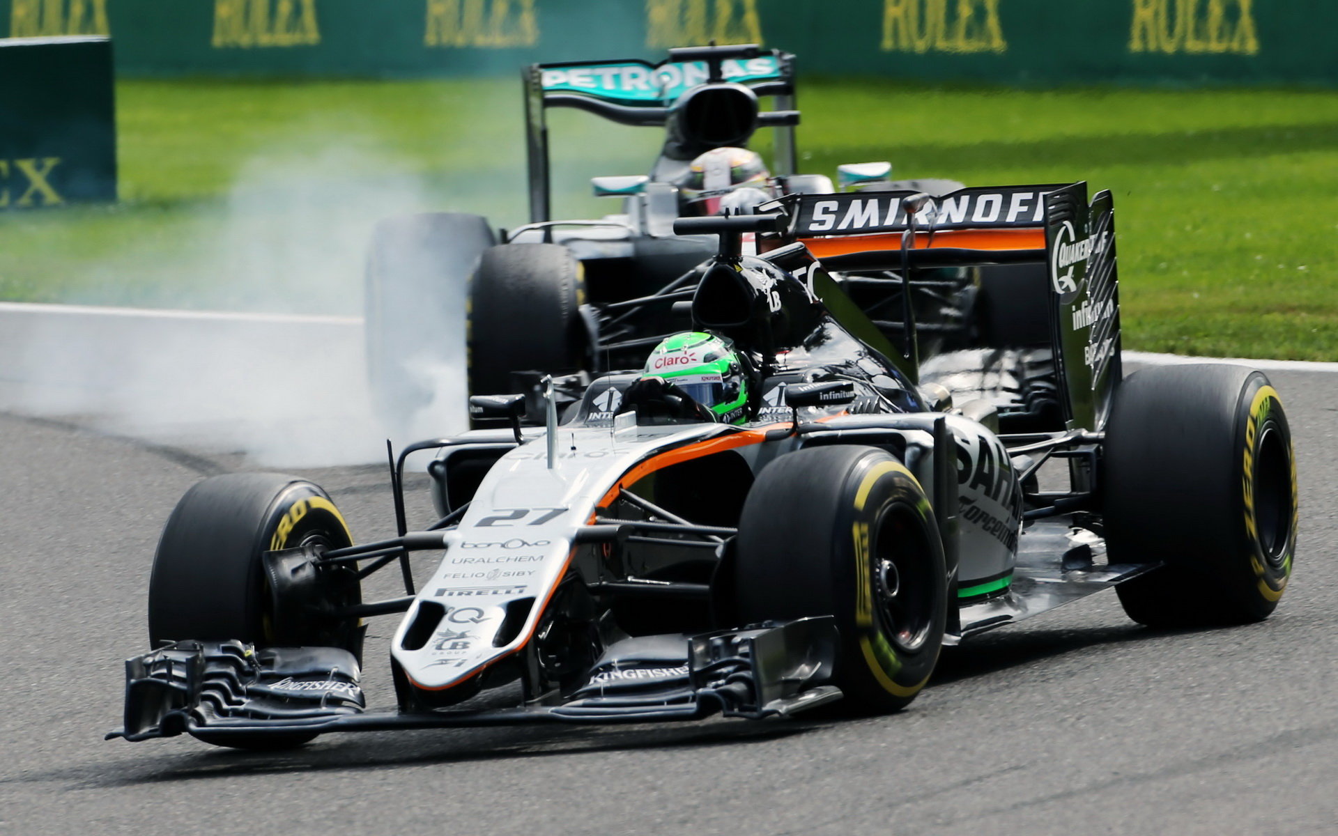 Nico Hülkenberg a Lewis Hamilton v závodě v Belgii