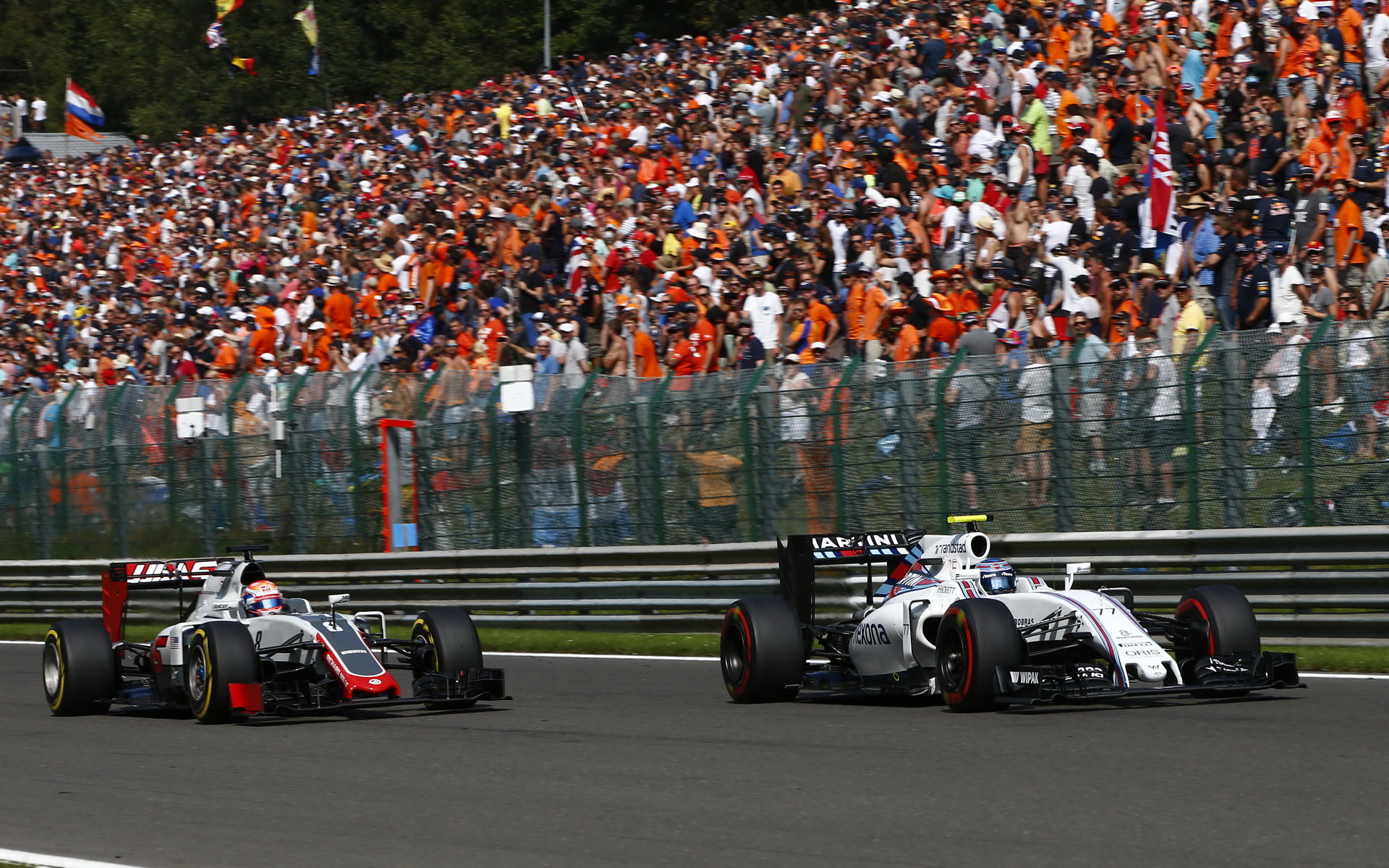 Romain Grosjean a Valtteri Bottas v závodě v Belgii