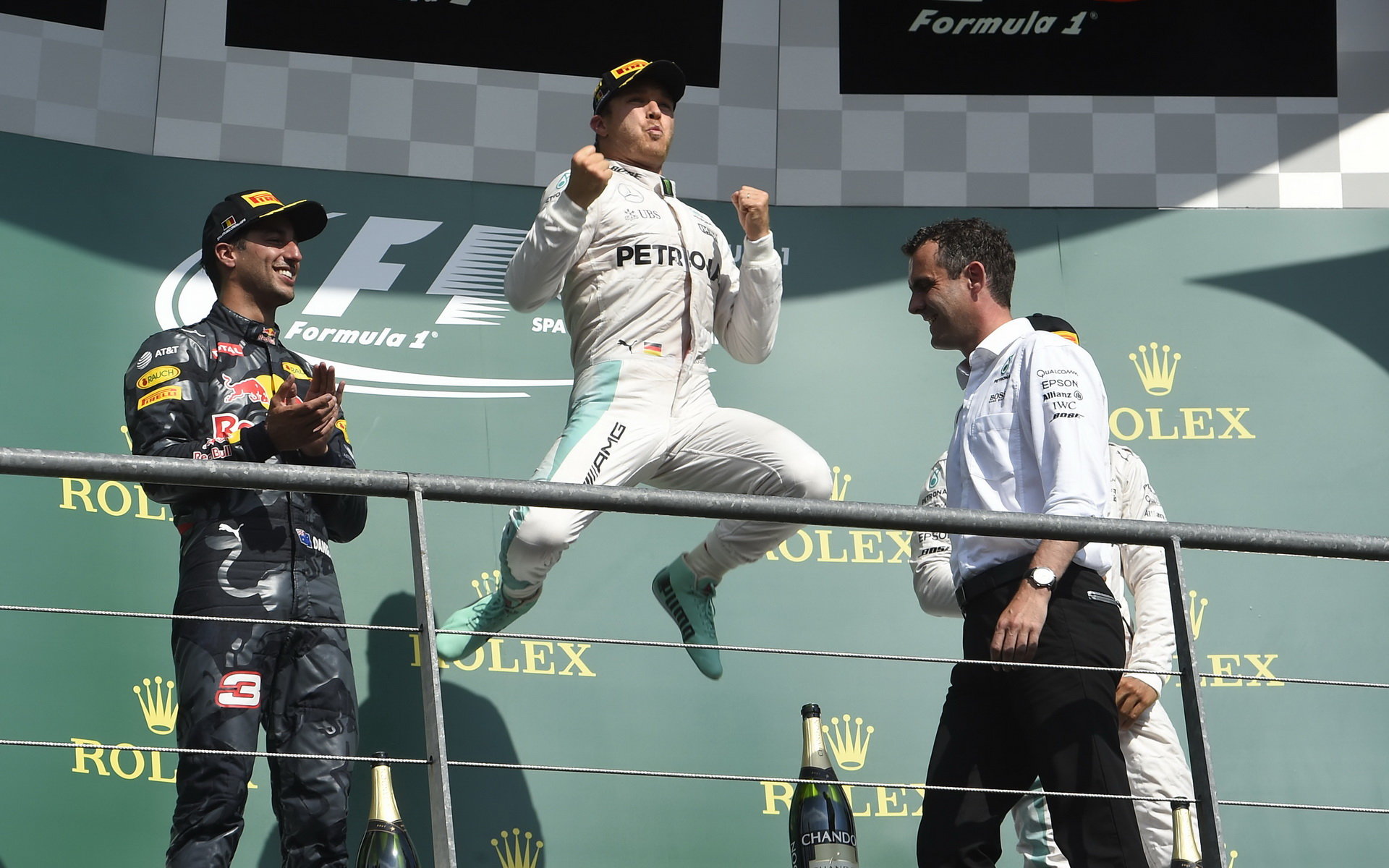 Radost Nica Rosberga na pódiu po závodě v Belgii