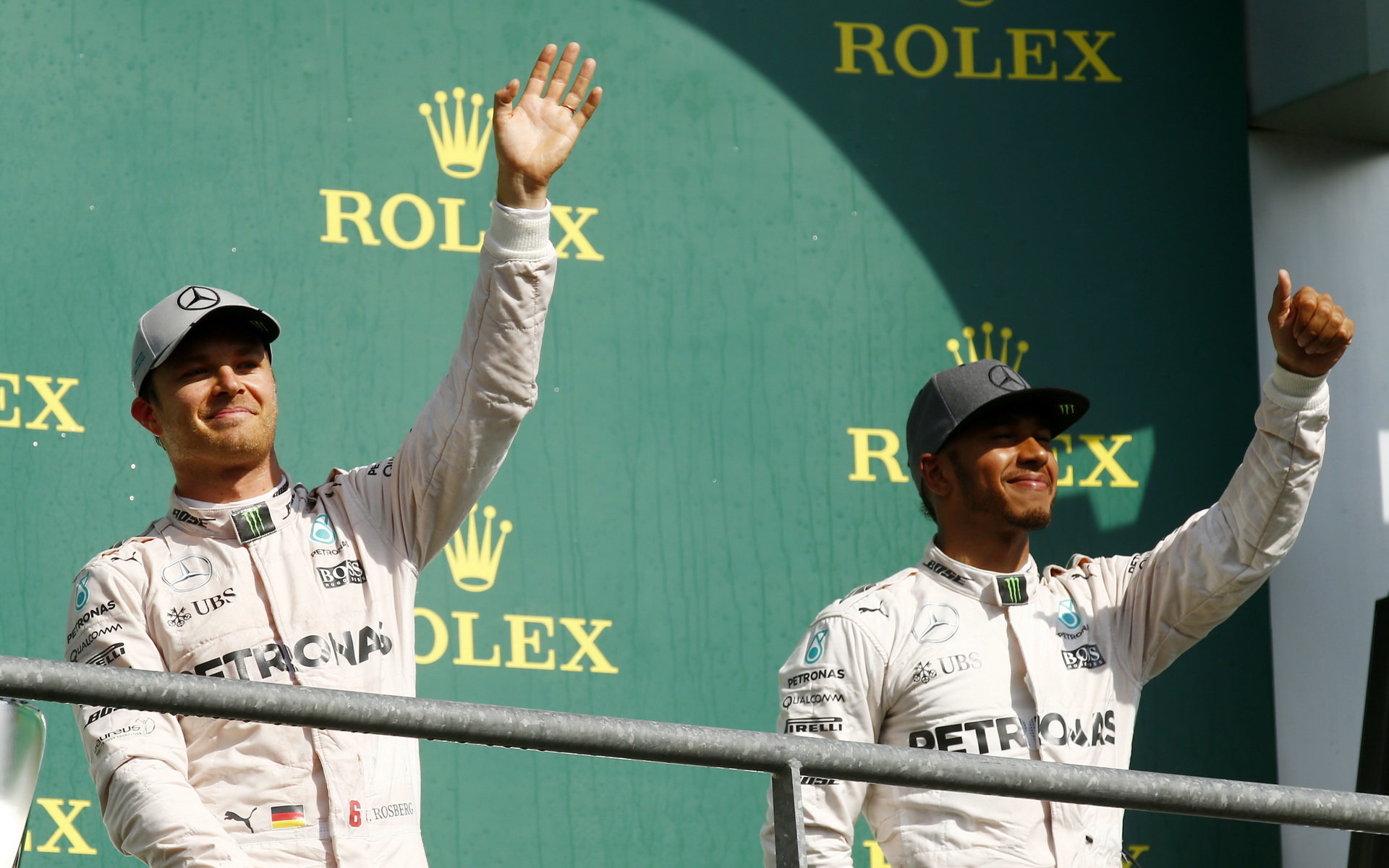 Nico Rosberg a Lewis Hamilton na pódiu po závodě v Belgii