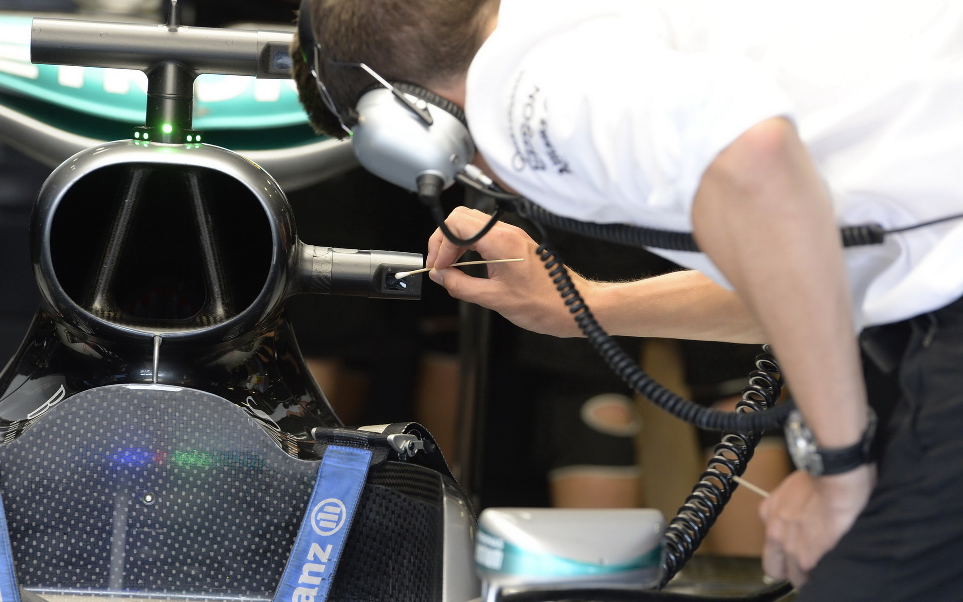 Čištění kameru na voze Mercedes v kvalifikaci na Monze