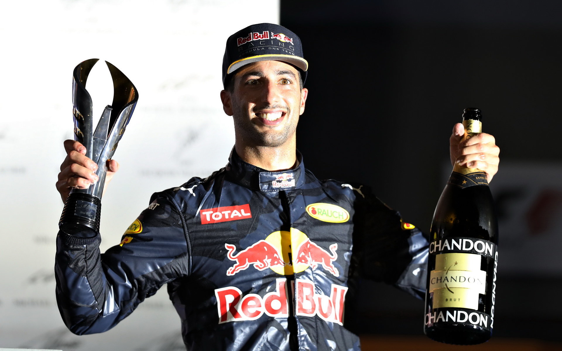 Daniel Ricciardo slaví na pódiu po závodě v Singapuru