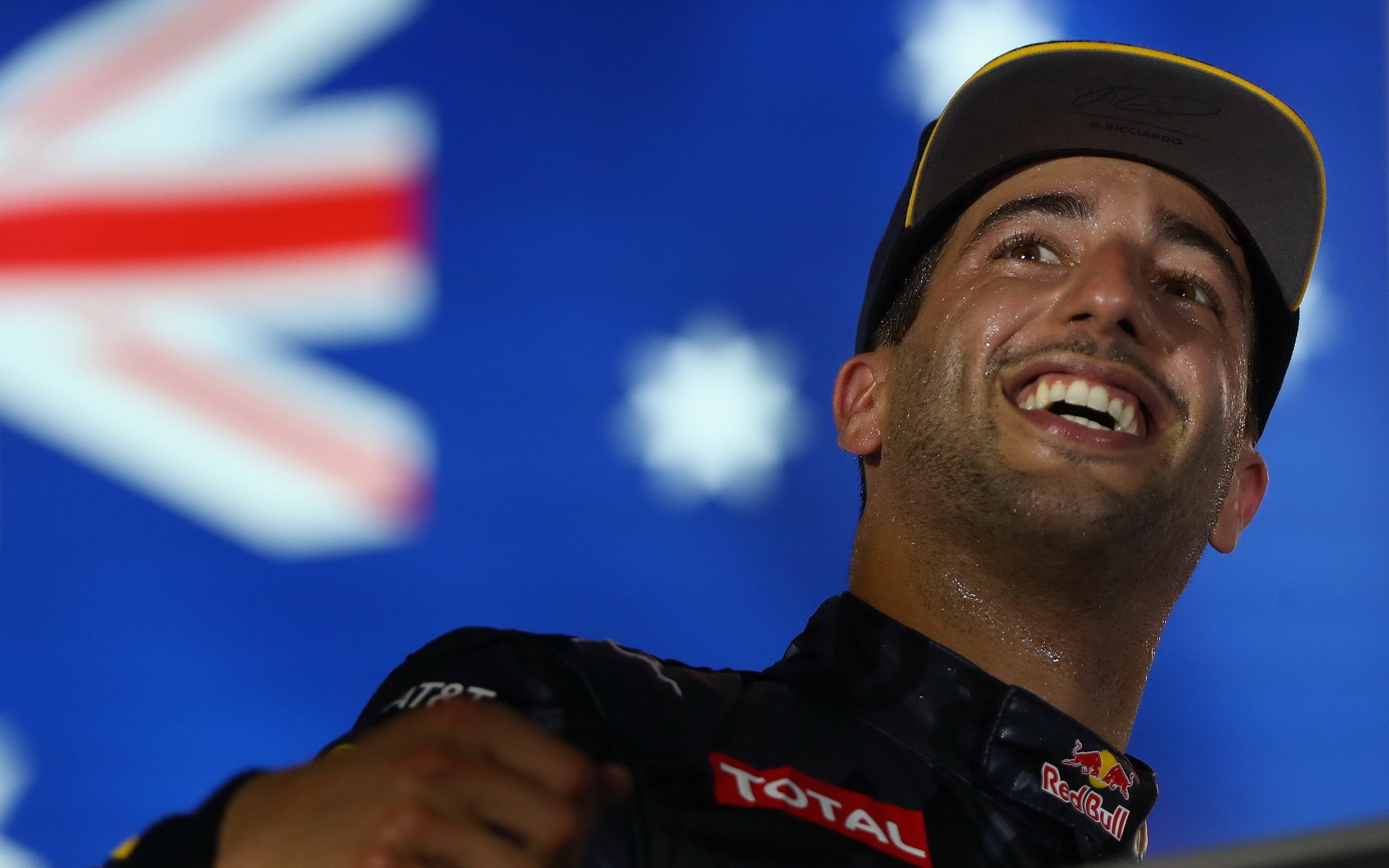 Daniel Ricciardo slaví na pódiu po závodě v Singapuru