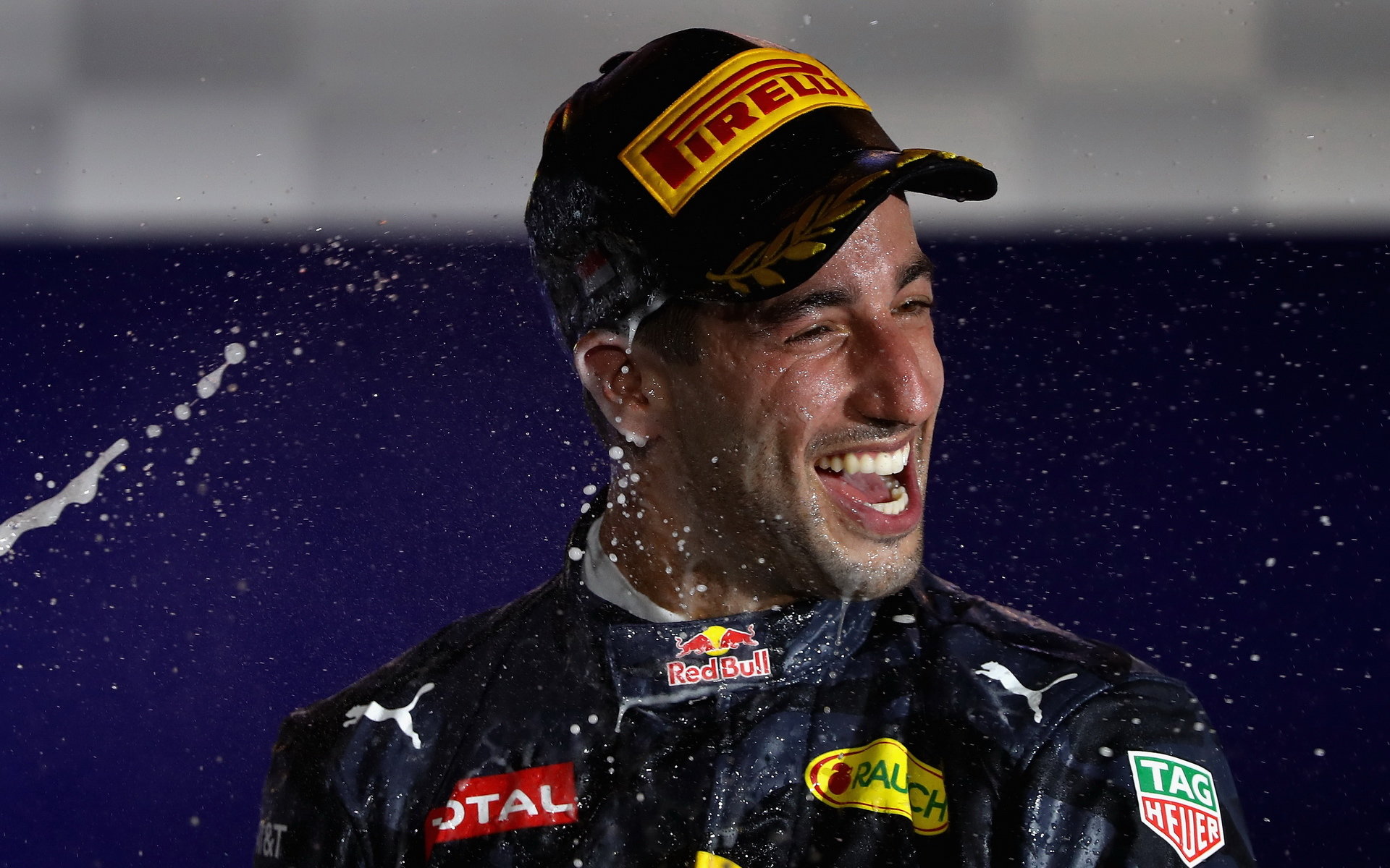 Daniel Ricciardo slaví na pódiu po závodě v Singapuru