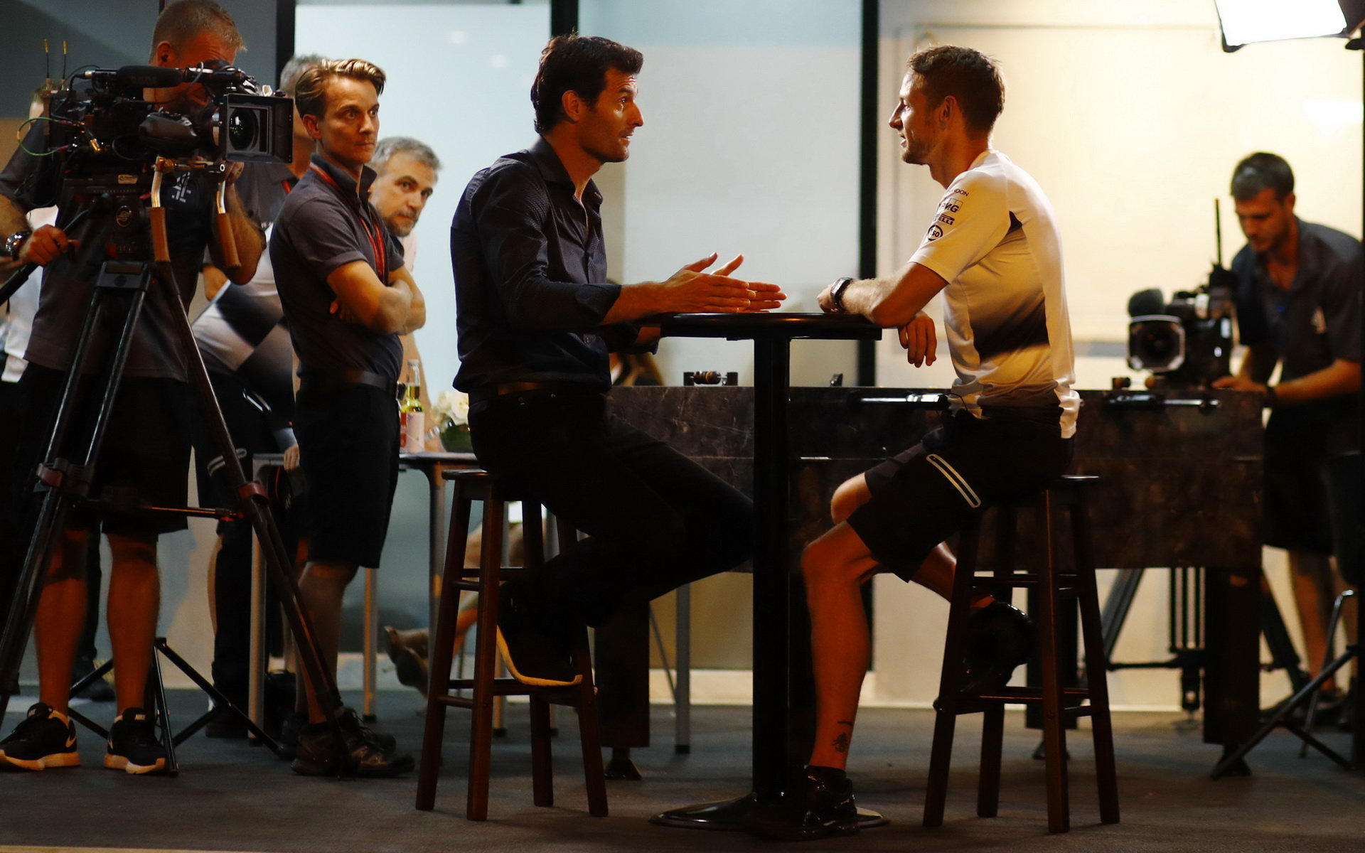 Jenson Button při rozhovoru s Markem Webberem v Malajsii