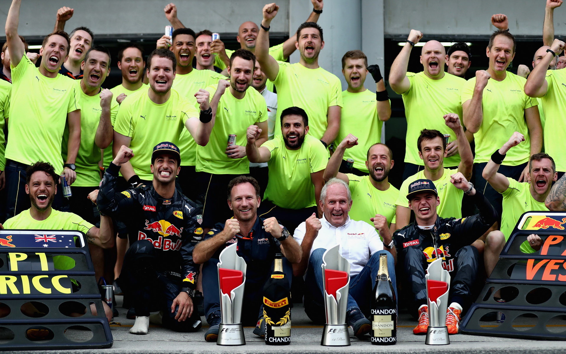 Oslavy týmu Red Bull z vítězství po závodě v Malajsii