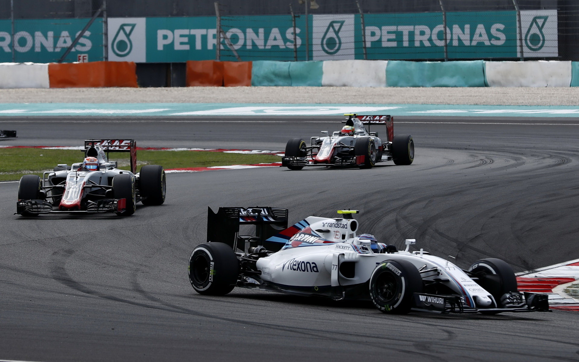 Valtteri Bottas před vozy Haasu v závodě v Malajsii