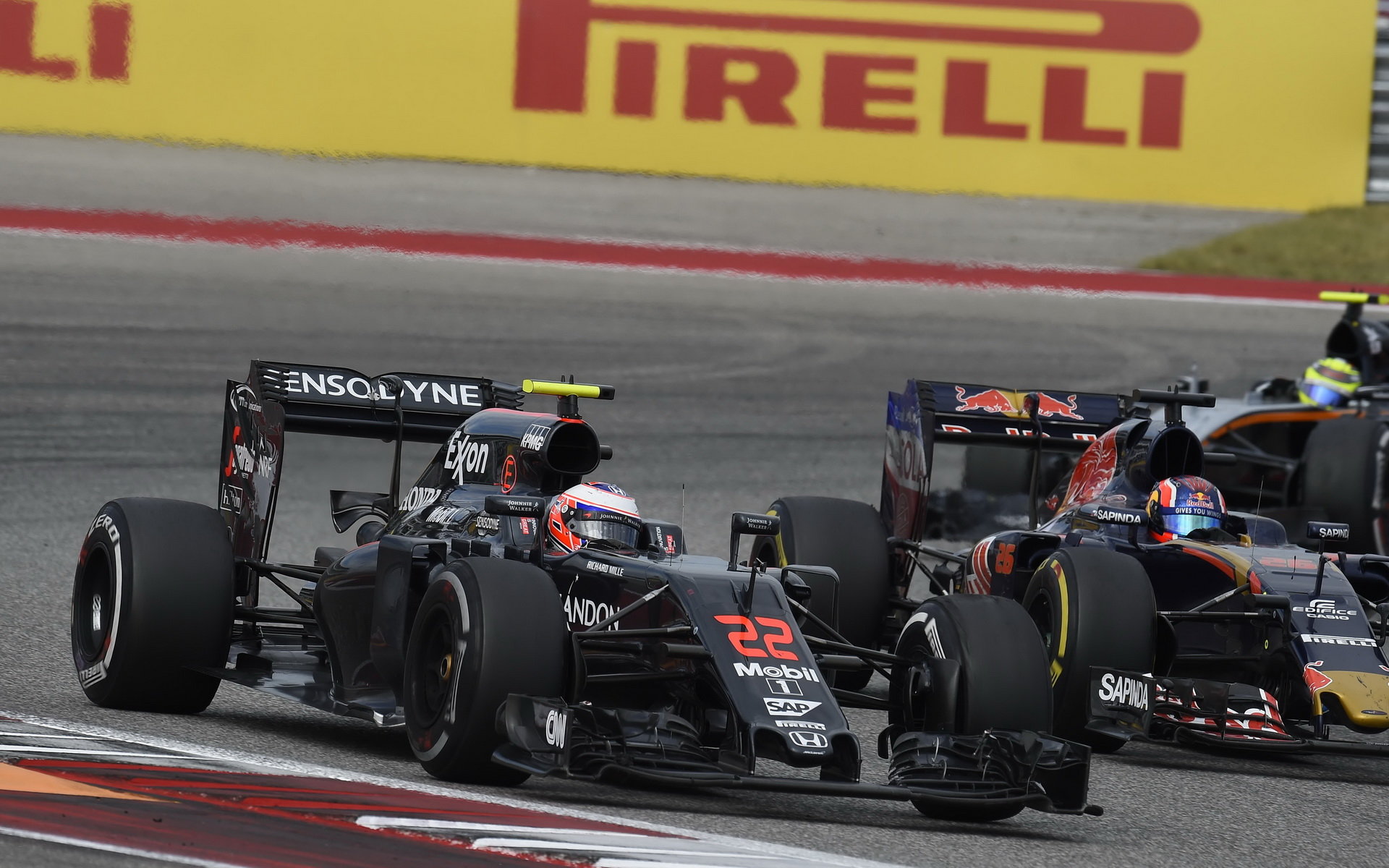 Jenson Button v souboji s Daniilem Kvjatem v Austinu