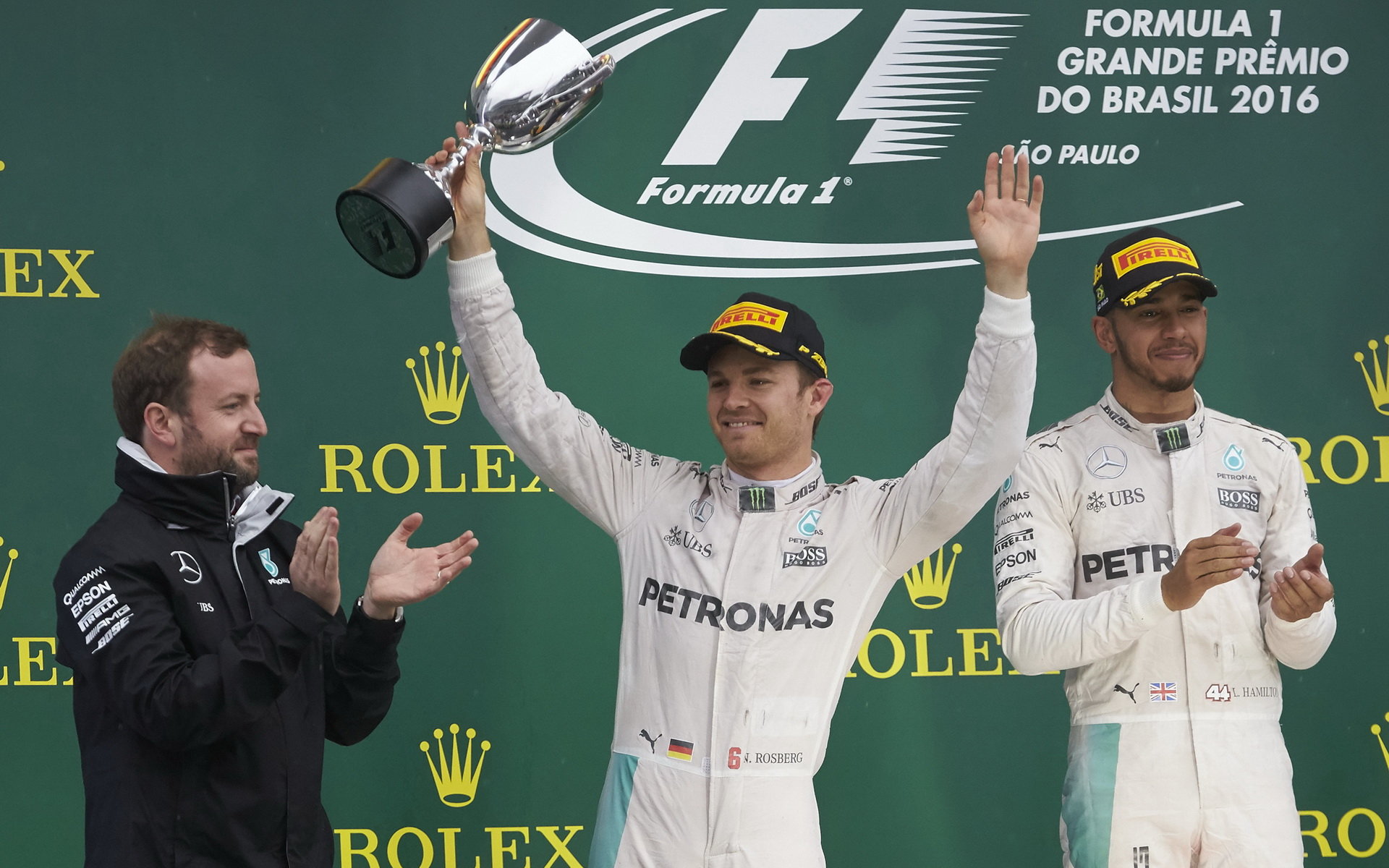 Lewis Hamilton a Nico Rosberg na pódiu po závodě v Brazílii