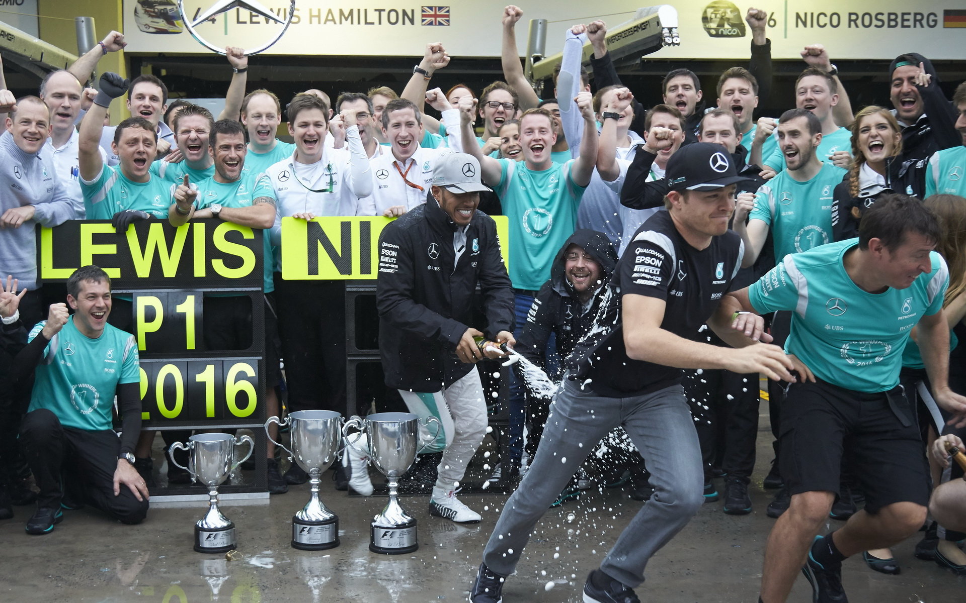 Radost týmu Mercedes z vítězství v závodě v Brazílii