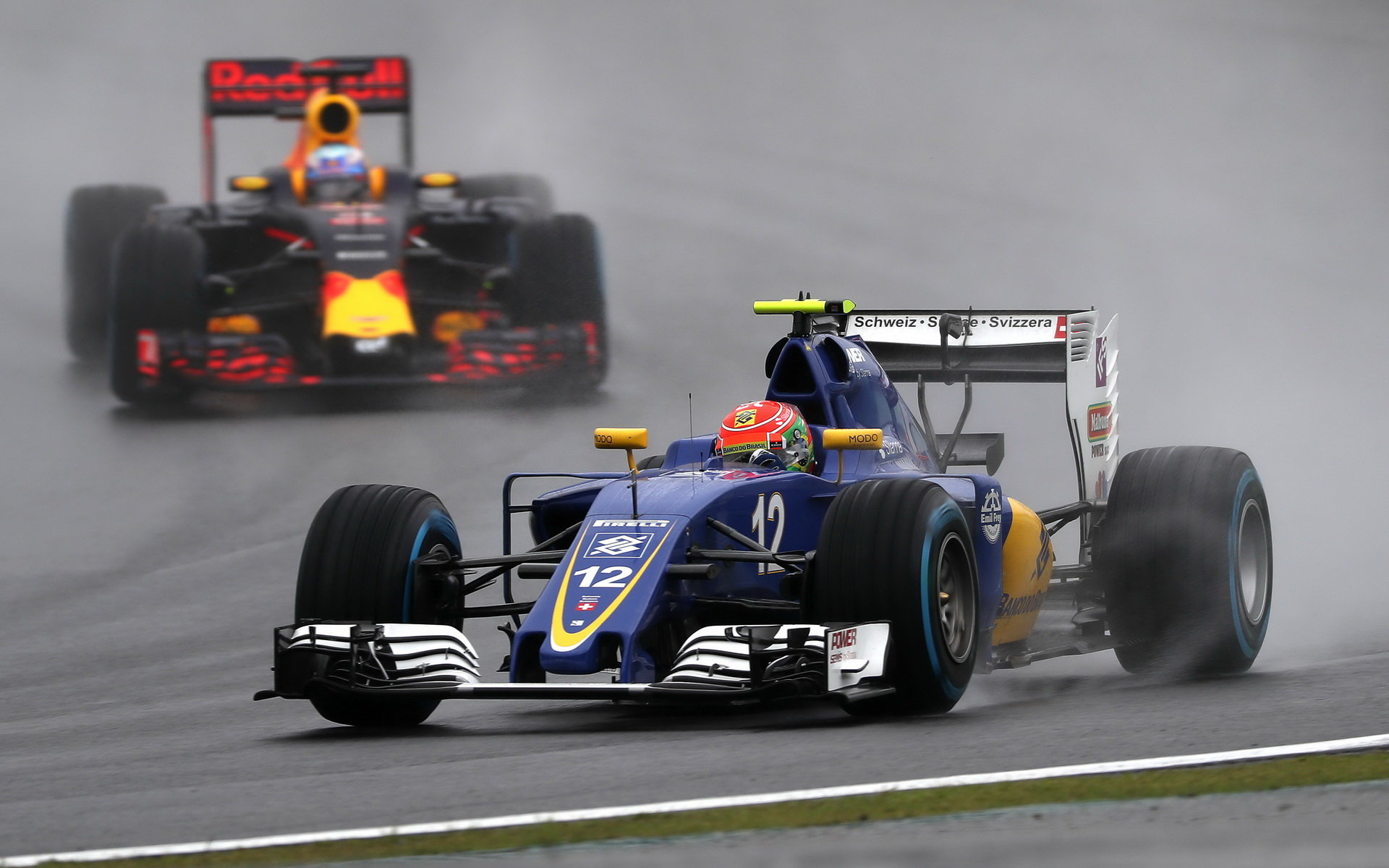 Felipe Nasr a Daniel Ricciardo počas deštivého závodu v Brazílii