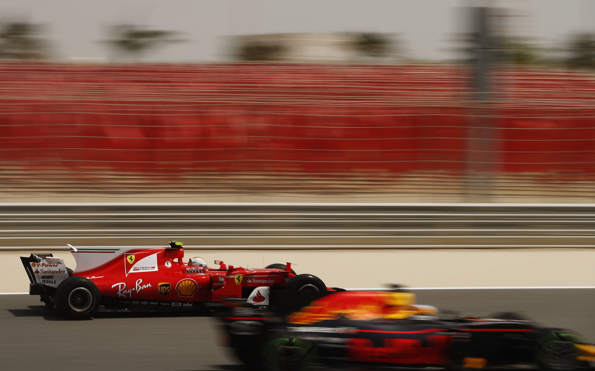 Sebastian Vettel předjíždí vůz Red Bull při sezónních testech v Bahrajnu