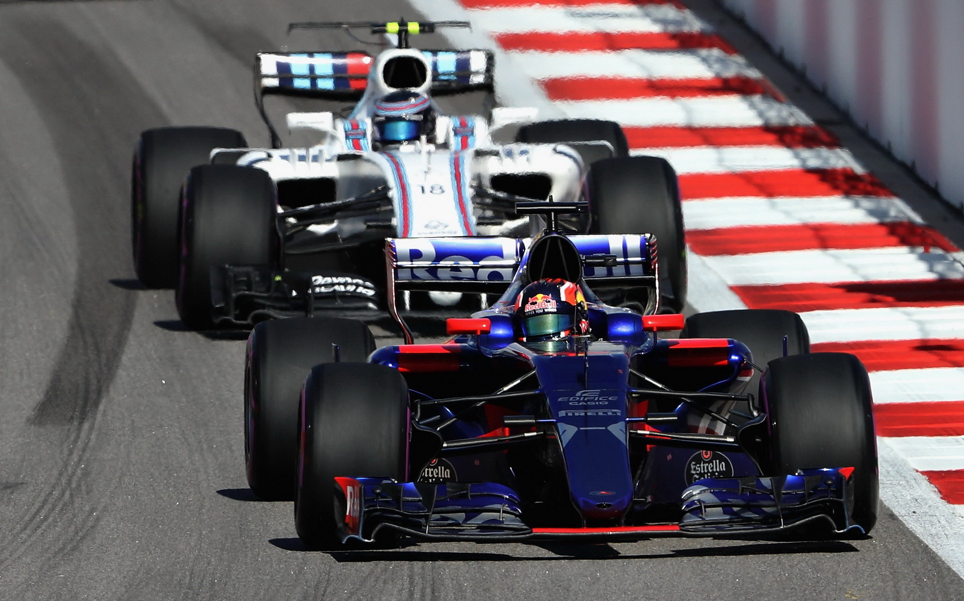 Daniil Kvjat a Lance Stroll v závodě v Soči