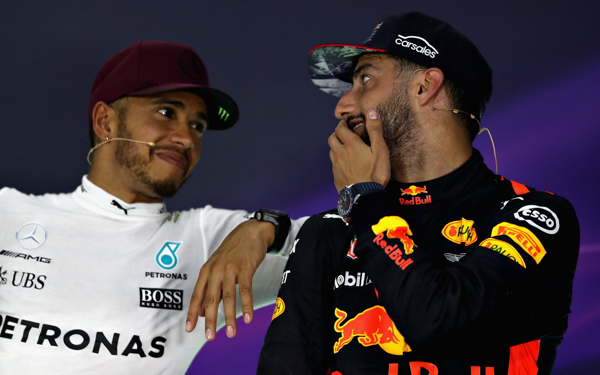 Lewis Hamilton a Daniel Ricciardo na tiskovce po závodě v Kanadě
