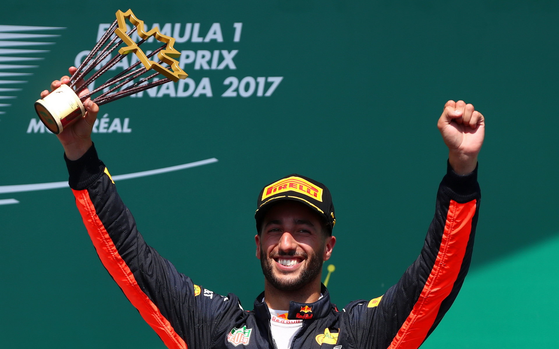 Daniel Ricciardo se svou trofejí na pódiu po závodě v Kanadě