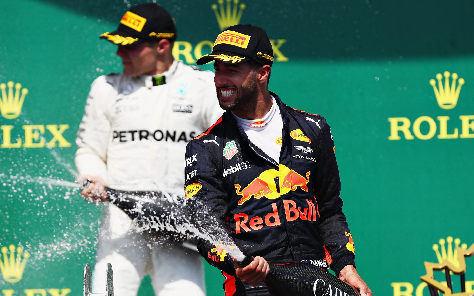Daniel Ricciardo si užíval chvíle na pódiu po závodě v Kanadě