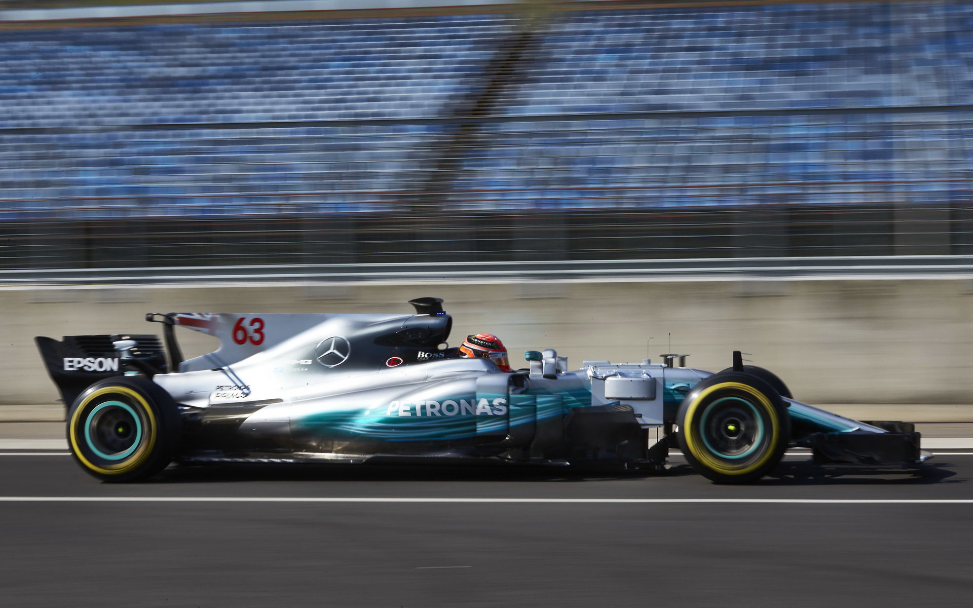George Russell testuje první den vůz Mercedes F1 W08 EQ Power+ v Maďarsku
