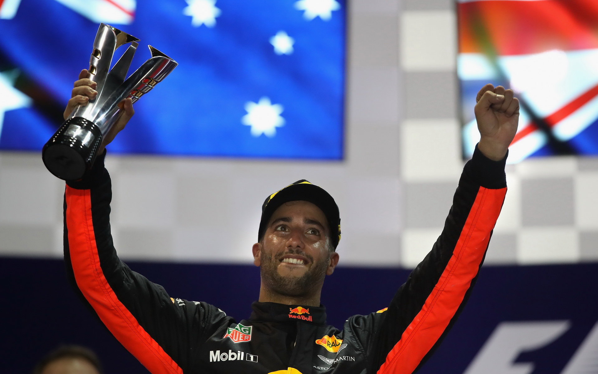 Daniel Ricciardo na pódiu se svou trofejí po závodě v Singapuru