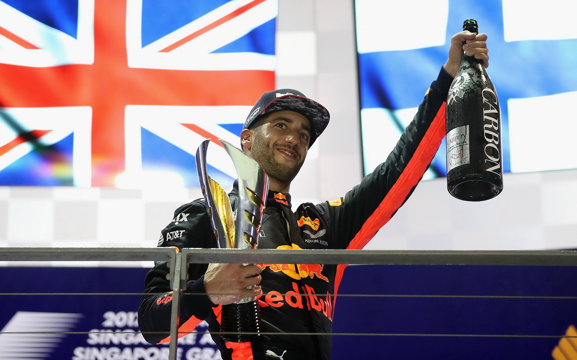 Daniel Ricciardo na pódiu se svou trofejí po závodě v Singapuru