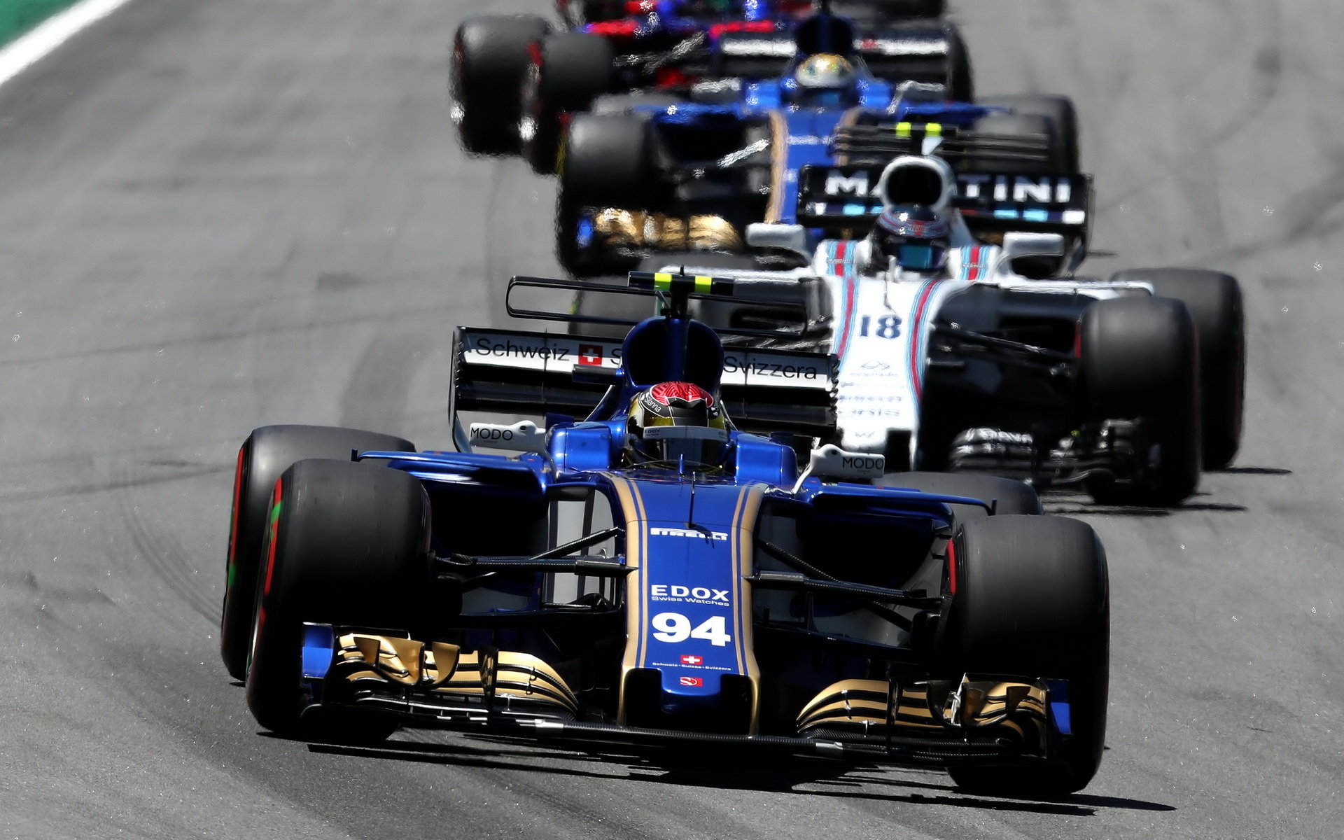 Pascal Wehrlein a Lance Stroll v závodě v Brazílii