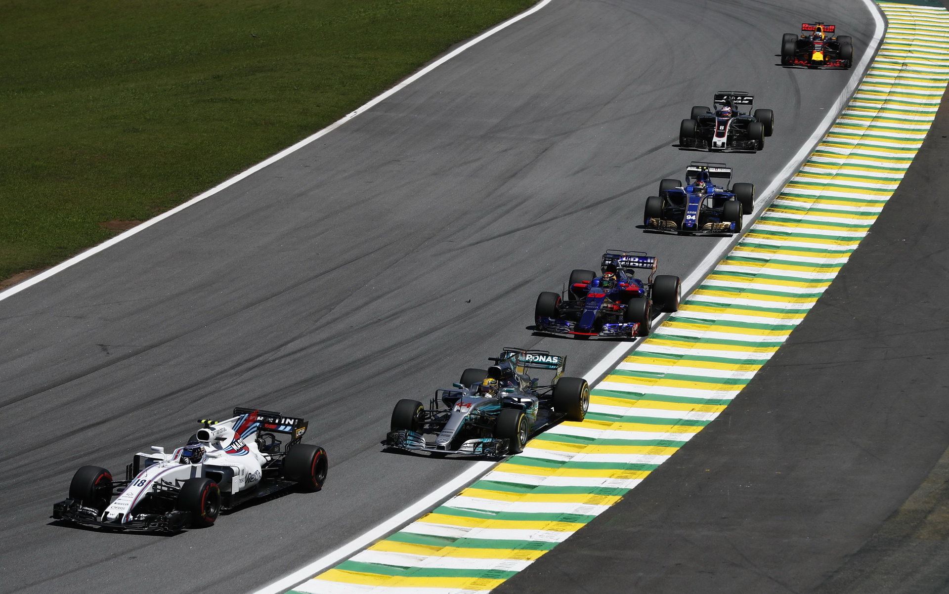Lance Stroll a Lewis Hamilton v závodě v Brazílii
