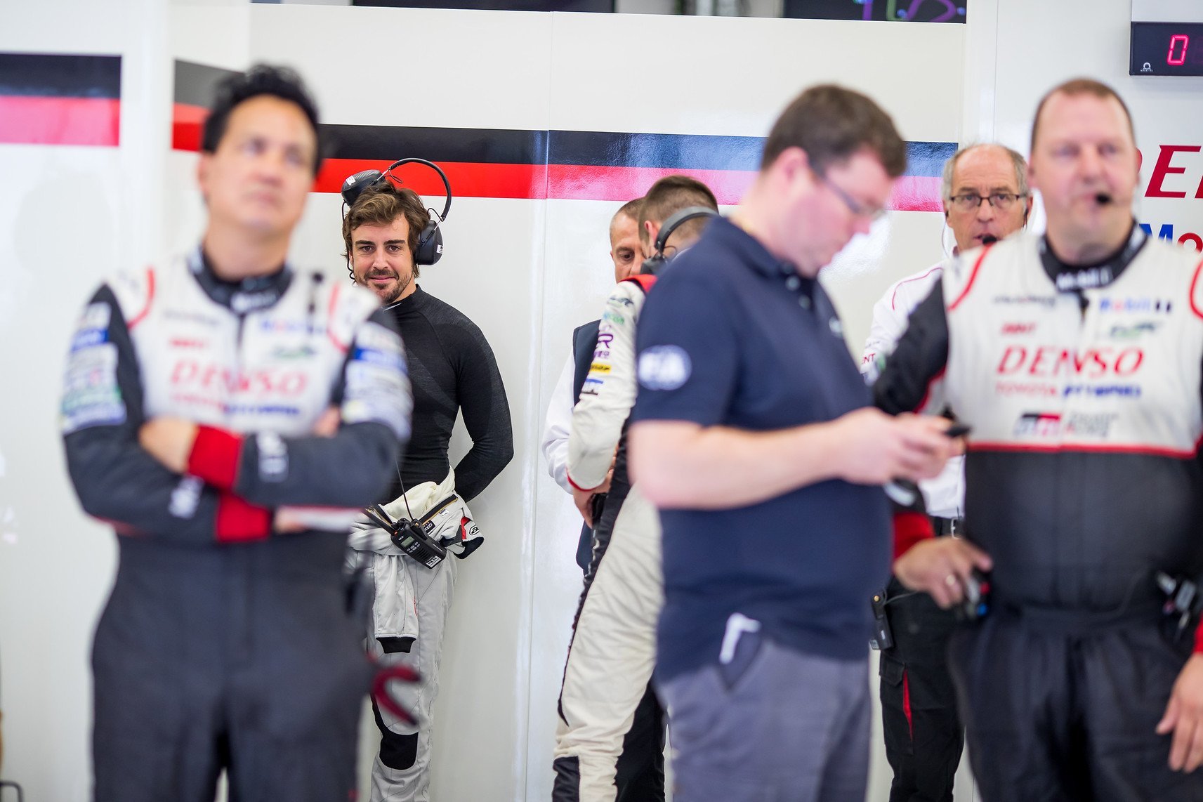 Fernando Alonso se usmívá v boxech Toyoty před svou testovací jízdou s vozem kategorie LMP1