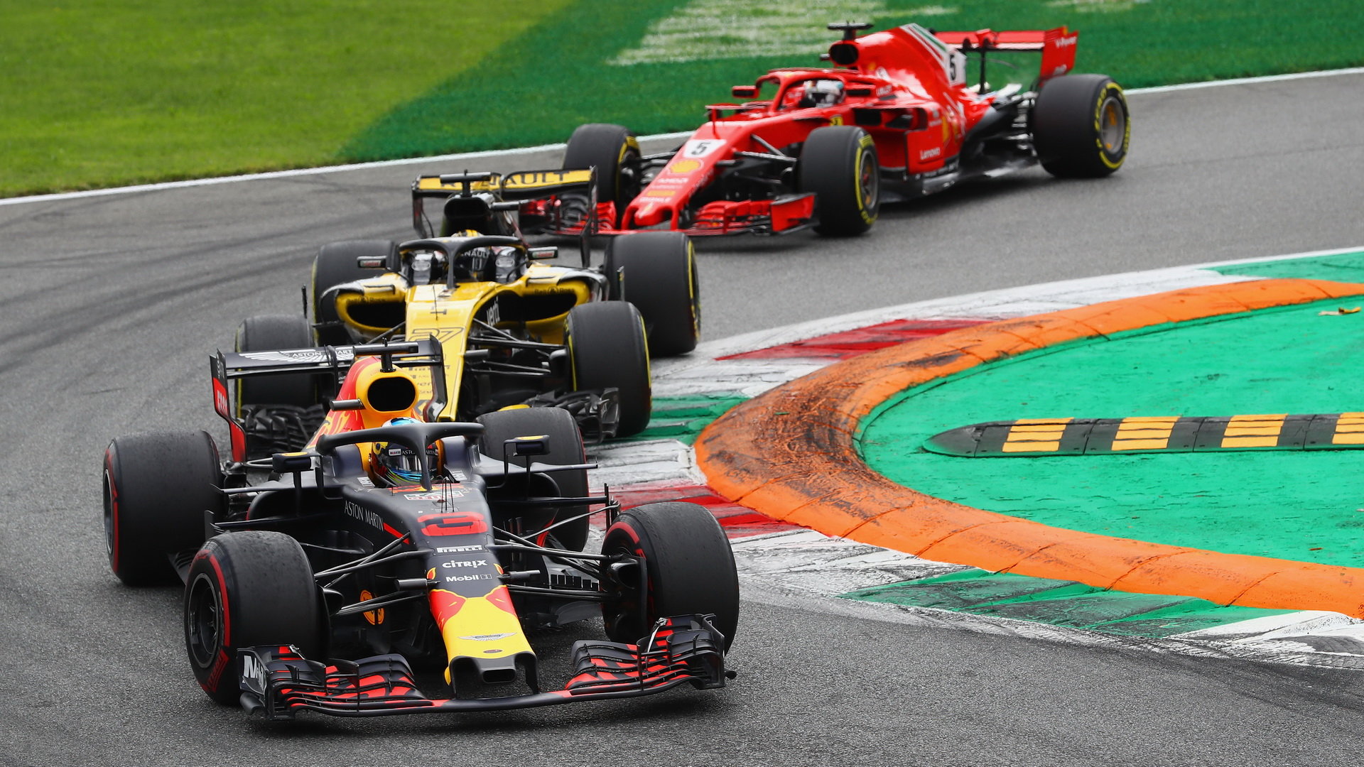 Daniel Ricciardo, Nico Hülkenberg a Sebastian Vettel v závodě v Monze